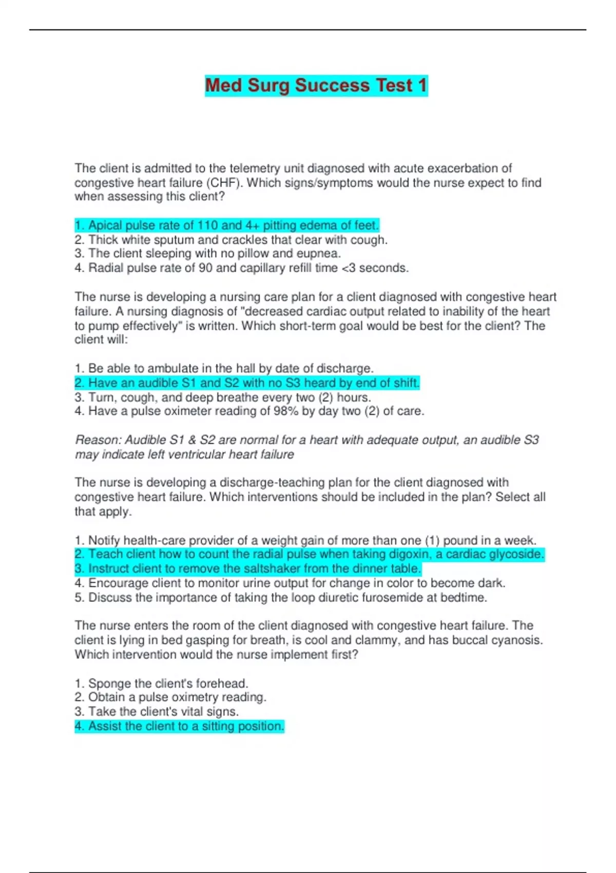 Med Surg Success Test 1 | Answered with complete solutions The client is admitted to the telemetry unit diagnosed with acute exacerbation of congestive heart failure (CHF). Which signs/symptoms would the nurse expect to find when assessing this client? 1. Apical pulse rate of 110 and 4+ pitting edema of feet. 2. Thick white sputum and crackles that clear with cough. 3. The client sleeping with no pillow and eupnea. 4. Radial pulse rate of 90 and capillary refill time <3 seconds. The nurse is developing a nursing care plan for a client diagnosed with congestive heart failure. A nursing diagnosis of "decreased cardiac output related to inability of the heart to pump effectively" is written. Which short-term goal would be best for the client? The client will: 1. Be able to ambulate in the hall by date of discharge. 2. Have an audible S1 and S2 with no S3 heard by end of shift. 3. Turn, cough, and deep breathe every two (2) hours. 4. Have a pulse oximeter reading of 98% by day two (2) of care. Reason: Audible S1 & S2 are normal for a heart with adequate output, an audible S3 may indicate left ventricular heart failure The nurse is developing a discharge-teaching plan for the client diagnosed with congestive heart failure. Which interventions should be included in the plan? Select all that apply. 1. Notify health-care provider of a weight gain of more than one (1) pound in a week. 2. Teach client how to count the radial pulse when taking digoxin, a cardiac glycoside. 3. Instruct client to remove the saltshaker from the dinner table. 4. Encourage client to monitor urine output for change in color to become dark. 5. Discuss the importance of taking the loop diuretic furosemide at bedtime. The nurse enters the room of the client diagnosed with congestive heart failure. The client is lying in bed gasping for breath, is cool and clammy, and has buccal cyanosis. Which intervention would the nurse implement first? 1. Sponge the client's forehead. 2. Obtain a pulse oximetry reading. 3. Take the client's vital signs. 4. Assist the client to a sitting position. The nurse is assessing the client diagnosed with congestive heart failure. Which signs/symptoms would indicate that the medical treatment has been effective? 1. The client's peripheral pitting edema has gone from 3+ to 4+. 2. The client is able to take the radial pulse accurately. 3. The client is able to perform ADLs without dyspnea. 4. The client has minimal jugular vein distention. The nurse is assessing the client diagnosed with congestive heart failure. Which laboratory data would indicate that the client is in severe congestive heart failure? 1. An elevated B-type natriuretic peptide (BNP). 2. An elevated creatine kinase (CK-MB). 3. A positive D-dimer. 4. A positive ventilation/perfusion (V/Q) scan. The health-care provider has ordered an angiotensin-converting enzyme (ACE) inhibitor for the client diagnosed with congestive heart failure. Which discharge instructions should the nurse include? 1. Instruct the client to take a cough suppressant if a cough develops. 2. Teach the client how to prevent orthostatic hypotension. 3. Encourage the client to eat bananas to increase potassium level. 4. Explain the importance of taking the medication with food. The nurse on the telemetry unit has just received the a.m. shift report. Which client should the nurse assess first? 1. The client diagnosed with myocardial infarction who has an audible S3 heart sound. 2. The client diagnosed with congestive heart failure who has 4+ sacral pitting edema. 3. The client diagnosed with pneumonia who has a pulse oximeter reading of 94%. 4. The client with chronic renal failure who has an elevated creatinine level. An audible S3 indicates left ventricular heart failure and the nurse must assess this client first because it is an emergency situation The nurse and an unlicensed assistive personnel (UAP) are caring for four clients on a telemetry unit. Which nursing task would be best for the nurse to delegate to the UAP? 1. Assist the client to go down to the smoking area for a cigarette. 2. Transport the client to the intensive care unit via a stretcher. 3. Provide the client going home discharge-teaching instructions. 4. Help position the client who is having a portable x-ray done. The charge nurse is making shift assignments for the medical floor. Which client should be assigned to the most experienced registered nurse? 1. The client diagnosed with congestive heart failure who is being discharged in the morning. 2. The client who is having frequent incontinent liquid bowel movements and vomiting. 3. The client with an apical pulse rate of 116, a respiratory rate of 26, and a blood pressure of 94/62. 4. The client who is complaining of chest pain with inspiration and a nonproductive cough. this client is exhibiting signs and symptoms of shock, the client is becoming unstable & needs an experienced nurse. The client diagnosed with congestive heart failure is complaining of leg cramps at night. Which nursing interventions should be implemented? 1. Check the client for peripheral edema and make sure the client takes a diuretic early in the day. 2. Monitor the client's potassium level and assess the client's intake of bananas and orange juice. 3. Determine if the client has gained weight and instruct the client to keep the legs elevated. 4. Instruct the client to ambulate frequently and perform calf-muscle stretching exercises daily. The probable cause of leg cramping is potassium excretion as a result of diuretic medications. Bananas and orange juice are high in potassium for a patient on diuretics. The nurse has written an outcome goal "demonstrates tolerance for increased activity" for a client diagnosed with congestive heart failure. Which intervention should the nurse implement to assist the client to achieve this outcome? 1. Measure intake and output. 2. Provide two (2)-g sodium diet. 3. Weigh client daily. 4. Plan for frequent rest periods. Scheduling rest perio