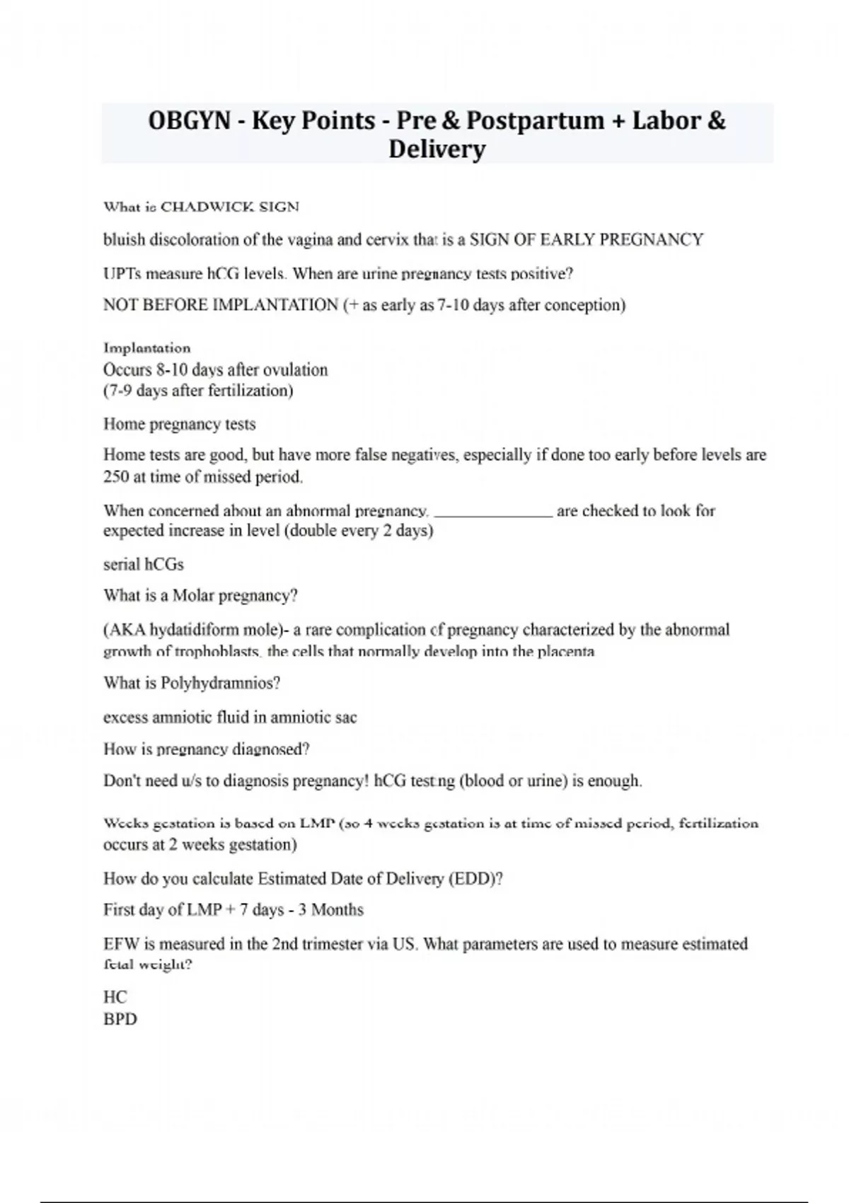 OBGYN - Key Points - Pre & Postpartum + Labor & Delivery