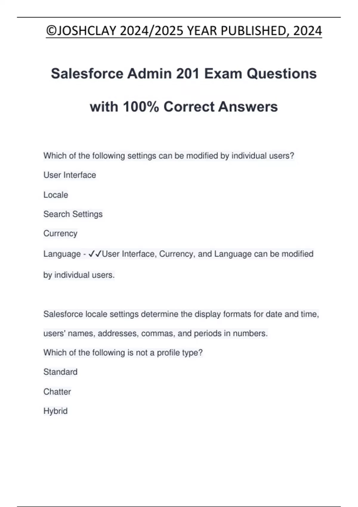 Salesforce Admin 201 Exam Questions with 100% Correct Answers Which of the following settings can be modified by individual users? User Interface Locale Search Settings Currency Language - User Interface, Currency, and Language can be modified by individual users. Salesforce locale settings determine the display formats for date and time, users' names, addresses, commas, and periods in numbers. Which of the following is not a profile type? Standard Chatter Hybrid