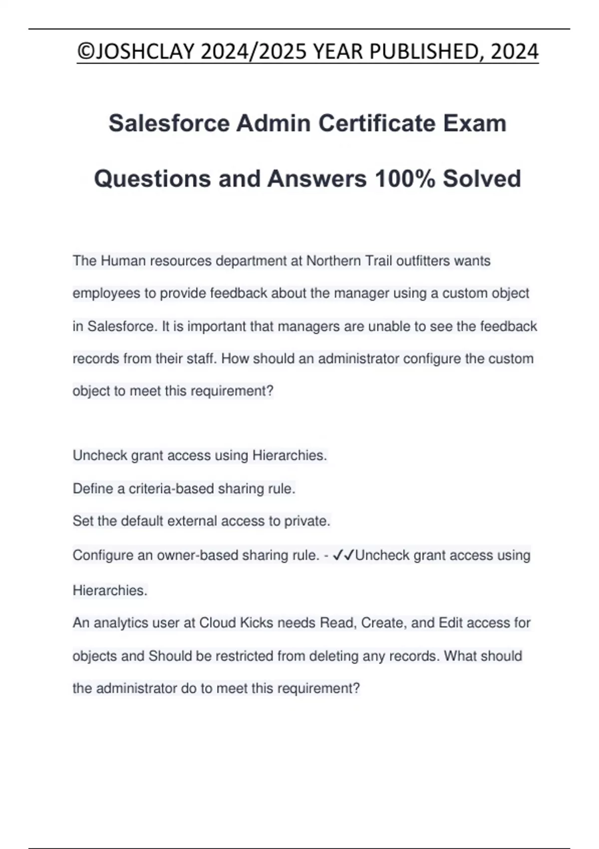 Salesforce Admin Certificate Exam Questions and Answers 100% Solved The Human resources department at Northern Trail outfitters wants employees to provide feedback about the manager using a custom object in Salesforce. It is important that managers are unable to see the feedback records from their staff. How should an administrator configure the custom object to meet this requirement? Uncheck grant access using Hierarchies. Define a criteria-based sharing rule. Set the default external access to private. Configure an owner-based sharing rule. - Uncheck grant access using Hierarchies. An analytics user at Cloud Kicks needs Read, Create, and Edit access for objects and Should be restricted from deleting any records. What should the administrator do to meet this requirement?
