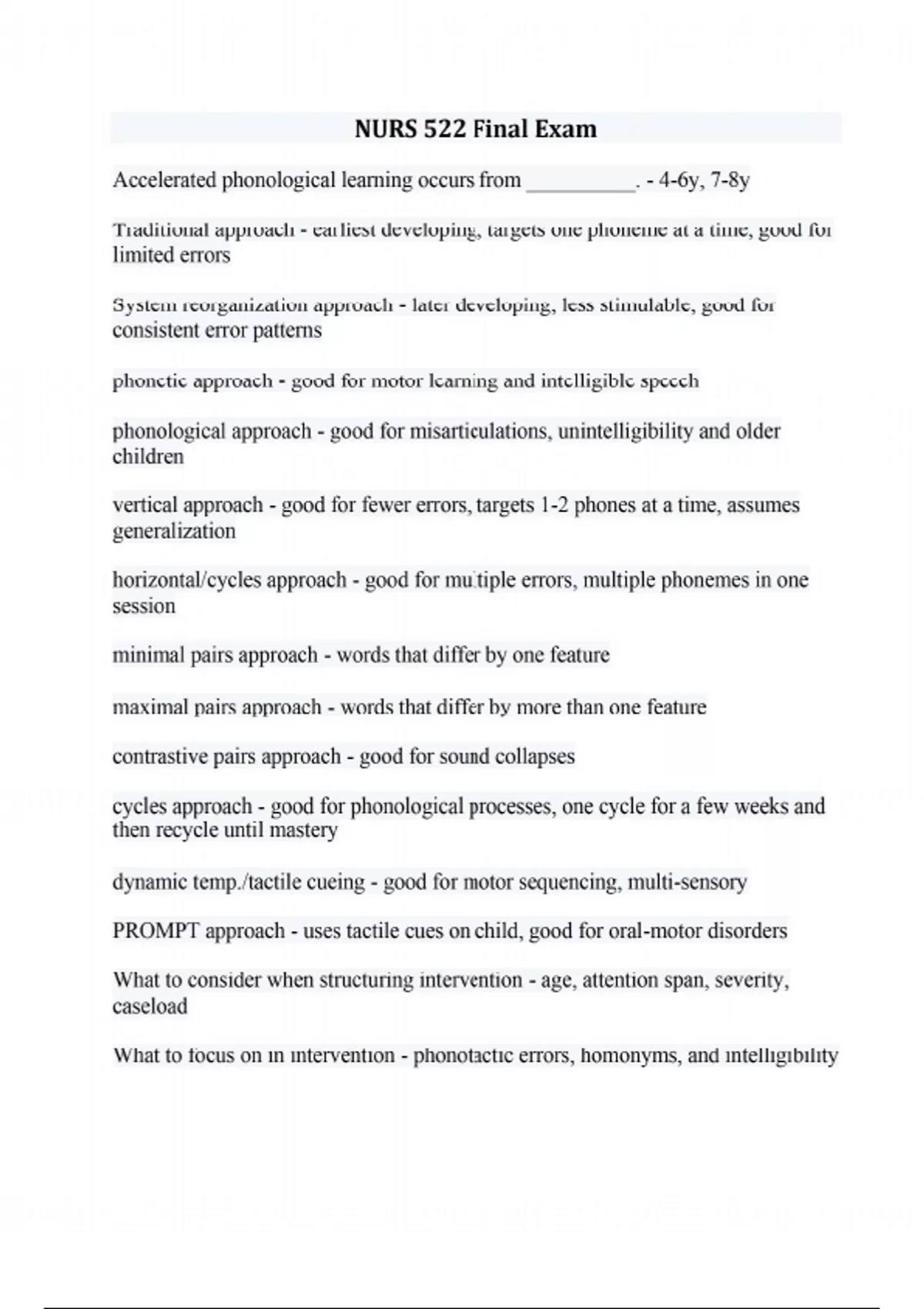 Accelerated phonological learning occurs from __________. - 4-6y, 7-8y Traditional approach - earliest developing, targets one phoneme at a time, good for limited errors System reorganization approach - later developing, less stimulable, good for consistent error patterns phonetic approach - good for motor learning and intelligible speech phonological approach - good for misarticulations, unintelligibility and older children vertical approach - good for fewer errors, targets 1-2 phones at a time, assumes generalization horizontal/cycles approach - good for multiple errors, multiple phonemes in one session minimal pairs approach - words that differ by one feature maximal pairs approach - words that differ by more than one feature contrastive pairs approach - good for sound collapses cycles approach - good for phonological processes, one cycle for a few weeks and then recycle until mastery dynamic temp./tactile cueing - good for motor sequencing, multi-sensory PROMPT approach - uses tactile cues on child, good for oral-motor disorders What to consider when structuring intervention - age, attention span, severity, caseload What to focus on in intervention - phonotactic errors, homonyms, and intelligibility target selection approaches - IDEHNSCM (intellgibility, developmental order, early success, high value, non-developmental errors, stimulability, complexity, and morphophonological) What to do when performance level is too high? - increase complexity, change up phonetic environment, etc. What to do when performance is too low? - Reduce intensity, decrease complexity, simplify phonetic environment What to consider before dismissal? - Has maximum change been attatined? Can they maintain the accuracy? Are they using their skills in conversation? Can they self-monitor? Childhood Apraxia of Speech - neurological speech-sound disorder that affects the ability to plan and program the movement for speech How is CAS therapy different from SSD therapy? - It addresses motor sequencing instead of phoneme production?