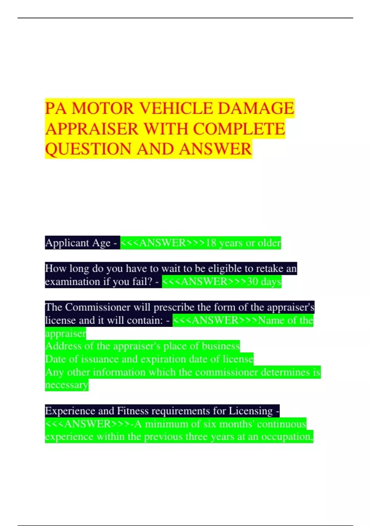 PA MOTOR VEHICLE DAMAGE APPRAISER WITH COMPLETE QUESTION AND ANSWER