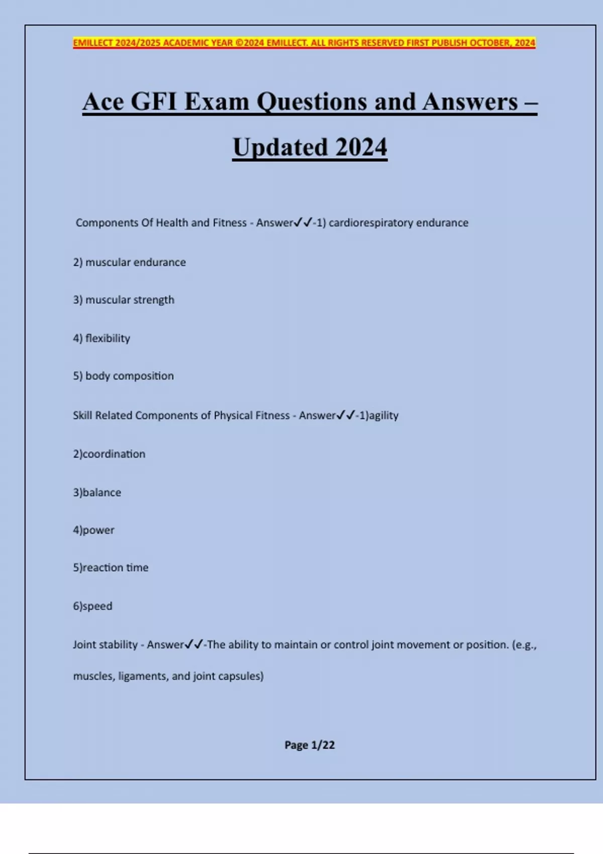 Ace GFI Exam Questions and Answers – Updated 2024 Components Of Health and Fitness - Answer-1) cardiorespiratory endurance 2) muscular endurance 3) muscular strength 4) flexibility 5) body composition Skill Related Components of Physical Fitness - Answer-1)agility 2)coordination 3)balance 4)power 5)reaction time 6)speed Joint stability - Answer-The ability to maintain or control joint movement or position. (e.g., muscles, ligaments, and joint capsules) EMILLECT 2024/2025 ACADEMIC YEAR ©2024 EMILLECT. ALL RIGHTS RESERVED FIRST PUBLISH OCTOBER, 2024 Page 2/22 Joint mobility - Answer-The range of uninhibited movement around a joint or body segment. Movement In Three Planes - Answer-sagittal, frontal, transverse Glenohumerol - Answer-Mobility Scapulothoracic - Answer-stability Thoracic Spine - Answer-Mobility Lumbar Spine - Answer-stability Hip - Answer-Mobility Knee - Answer-stability Ankle - Answer-Mobility Foot - Answer-Stability Transverse Plane - Answer-superior and inferior medial and lateral Frontal Plane - Answer-front (ventral) and back (Dorsal) Sagittal plane - Answer-a vertical plane that divides the body into right and left parts sagittal plane - Answer-Flexion (elbows, shoulders, knees, hips and spine) Extension (elbows, shoulders,knees,hips and spine) EMILLECT 2024/2025 ACADEMIC YEAR ©2024 EMILLECT. ALL RIGHTS RESERVED FIRST PUBLISH OCTOBER, 2024 Page 3/22 Plantar flexion( ankles) Dorsiflexion (ankles) Practical - indoor cycling occur in sagittal plane. Supine Pilates exercises and traditional abdominal crunches occur in sagittal plane, as well as many resistance-training exercises, such as squats and lunges. Frontal Plane - Answer-Frontal plane separates the body into anterior and posterior halves. Lateral movements occur in the frontal plane. Abduction (shoulders and hips) Addiction (shoulders and hips) Lateral spinal flexion Ankle eversion and inversion Aquatic fitness, like jumping Jack's and tic-tocs occur in the frontal plane as do common group exercise movements like the lateral lunge Transverse Plane - Answer-divides the body into upper (superior) and lower (inferior) parts rotation EMILLECT 2024/2025 ACADEMIC YEAR ©2024 EMILLECT. ALL RIGHTS RESERVED FIRST PUBLISH OCTOBER, 2024 Page 4/22 horizontal shoulder adduction and abduction practical- Pilates, abdominal/core exercises involving rotation, supine bicycle crunches, seated medicine ball trunk rotations occur in transverse plane Five primary movement patterns - Answer-bend and lift single leg pushing pulling rotation Well-Rounded Fitness Routine - Answer-Includes cardiorespiratory, strength, and flexibility exercise Three-Zone Intensity Model - Answer--Zone 1: Low-to-moderate intensity exercise, during which, the exerciser can talk comfortably - Zone 2: Moderate-to-vigorous intensity aerobic exercise, during which talking is a little challenging - Zone 3: vigorous-to-very vigorous exercise, during which the exerciser definitely cannot talk comfortably EMILLECT 2024/2025 ACADEMIC YEAR ©2024 EMILLECT. ALL RIGHTS RESERVED FIRST PUBLISH OCTOBER, 2024 Page 5/22 Each zone is separated by the participant's unique metabolic markers (ventilatory thresholds) ACE Integrated Fitness Training Model (ACE IFT) - Answer-Provides a systematic and comprehensive approach to exercise programming to facilitate behavior change while also improving posture, movement, flexibility, balance, core function, cardiorespiratory fitness, muscular endurance, and muscular strength. Consists of two components, each divided into four phases that run parallel to the function- health-fitness-performance continuum. 1. Functional Movement and Resistance Training 2. Cardiorespiratory Training Hyperflexion - Answer-flexion of a limb or part beyond the normal limits Hyperextension - Answer-extension beyond anatomical position Transverse abdominis - Answer-compresses abdomen, drawing in maneuver, and involvement in core bracing Anterior Tibialis - Answer-Joint action: Ankle dorsiflexion Gastrocnemius and Soleus - Answer-Joint action Ank