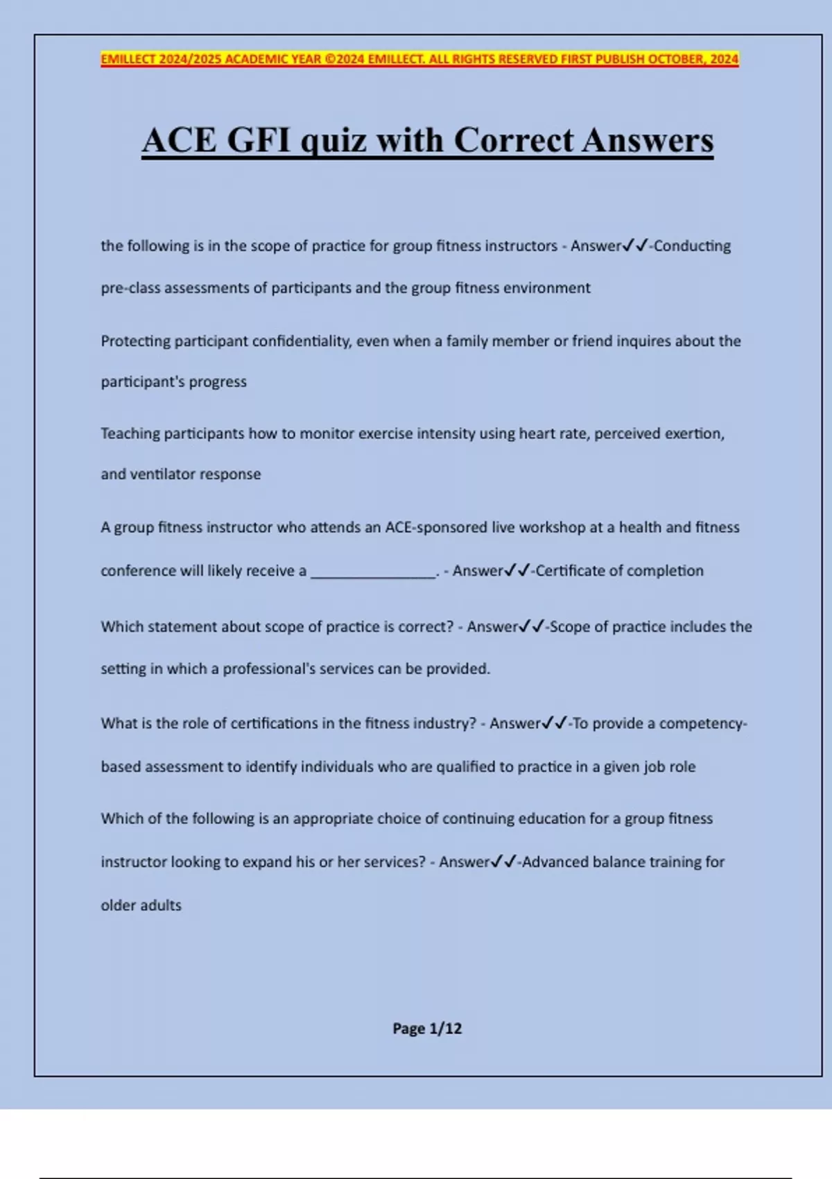ACE GFI quiz with Correct Answers the following is in the scope of practice for group fitness instructors - Answer-Conducting pre-class assessments of participants and the group fitness environment Protecting participant confidentiality, even when a family member or friend inquires about the participant's progress Teaching participants how to monitor exercise intensity using heart rate, perceived exertion, and ventilator response A group fitness instructor who attends an ACE-sponsored live workshop at a health and fitness conference will likely receive a _______________. - Answer-Certificate of completion Which statement about scope of practice is correct? - Answer-Scope of practice includes the setting in which a professional's services can be provided. What is the role of certifications in the fitness industry? - Answer-To provide a competency- based assessment to identify individuals who are qualified to practice in a given job role Which of the following is an appropriate choice of continuing education for a group fitness instructor looking to expand his or her services? - Answer-Advanced balance training for older adults EMILLECT 2024/2025 ACADEMIC YEAR ©2024 EMILLECT. ALL RIGHTS RESERVED FIRST PUBLISH OCTOBER, 2024 Page 2/12 What is considered to be a disadvantage of teaching pre-choreographed class formats? - Answer-The ongoing costs of new music and choreography Which of the following is the MOST appropriate method for increasing range of motion during the warm-up portion of a group fitness class? - Answer-Ballistic stretching Which of the following statements about the post-conditioning cool-down is MOST accurate? - Answer-Work should be less intense than during the conditioning segment of class. What occurs when a muscle spindle is activated due to a quick stretching of a muscle? - Answer-The muscle spindle causes a reflex contraction in the muscle stretched Performing muscular contractions at high velocity is primarily focused on improving which component of physical fitness? - Answer-Power What repetition range is recommended to effectively improve strength in older adults who are starting exercise? - Answer-10-15 The _______________ principle demonstrates the importance of continued physical activity throughout life - Answer-Reversibility Which of the following joints is designed to favor stability more than mobility? - Answer- Knee Which series of movements is performed in the sagittal plane? - Answer-Flexion, extension, plantar flexion, dorsiflexion EMILLECT 2024/2025 ACADEMIC YEAR ©2024 EMILLECT. ALL RIGHTS RESERVED FIRST PUBLISH OCTOBER, 2024 Page 3/12 Which of the following exercises is an example of adduction in the frontal plane? - Answer- Lateral shoulder raise Which of the following lists the primary movements required in the proper order to perform the following tasks: lift a heavy box off the floor, carry it upstairs, open a closet door, and place the box on a shelf high in the closet? - Answer-Bend-and-lift movement, single-leg movement, upper-body pulling movement, and upper- body pushing movement A person swimming laps in an effort to improve his or her cardiorespiratory fitness will PRIMARILY derive energy from which pathway? - Answer-Aerobic system The rectus femoris, vastus lateralis, vastus intermedius, and vastus medialis are collectively known as the _______________. - Answer-Quadriceps Which of the following core muscles is/are PRIMARILY responsible for spinal extension? - Answer-Erector spinae After observing a participant's posture, a group fitness instructor encourages him or her to stretch the muscles of the chest and work on strengthening the erector spinae, trapezius, and rhomboids. What type of posture did the instructor MOST likely observe in this individual? - Answer-Kyphosis Which of the following types of flooring is the BEST option when trying to control undesirable medial-lateral motions of the foot? - Answer-Wood EMILLECT 2024/2025 ACADEMIC YEAR ©2024 EMILLECT. ALL RIGHTS RESERVED FIRST PUBLISH OCTOBER, 2024 Page 4/12 Which combination of symptoms requires immediate medical attention? - Answer-Bright red skin color and labored breathing Cold environments can cause a generalized vasoconstriction that can be dangerous for individuals with _______________. - Answer-Hypertension What music volume would meet the recommendations for a high-intensity interval training class? - Answer-80 decibels Which of the following group fitness class formats would be a good match for using music in the foreground? - Answer-Dance-based fitness class Heart rate and the talk test are the two PRIMARY methods recommended for monitoring exercise intensity in which of the following group exercise class formats? - Answer-A high- intensity group indoor cycling class What is the primary disadvantage of using target heart rate to monitor intensity in a group setting? - Answer-The prediction equations have standard deviations of 7 to 12 beats per minute Which intensity-monitoring method takes into account each individual participant's metabolic responses to exercise? - Answer-Talk test What is the FIRST step in the planning process that GFIs ca