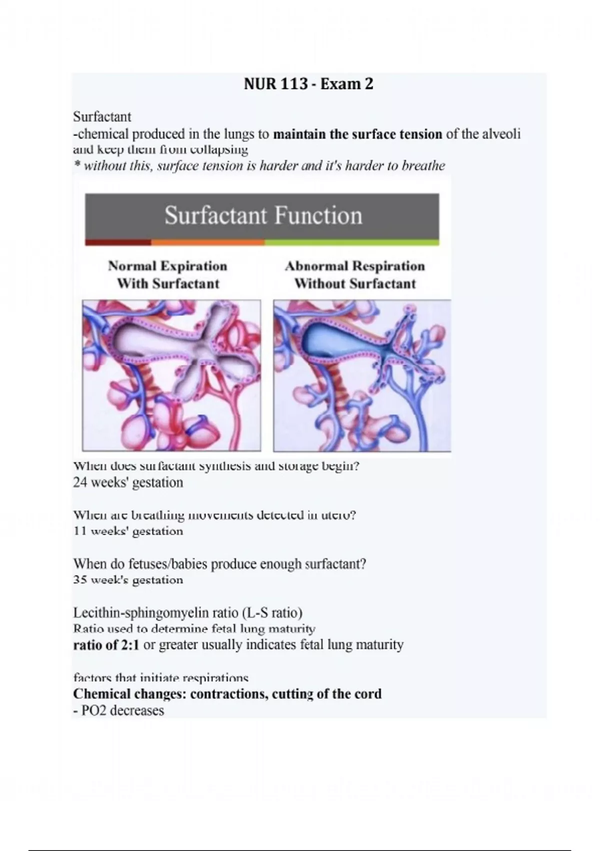 Surfactant -chemical produced in the lungs to maintain the surface tension of the alveoli and keep them from collapsing * without this, surface tension is harder and it's harder to breathe When does surfactant synthesis and storage begin? 24 weeks' gestation When are breathing movements detected in utero? 11 weeks' gestation When do fetuses/babies produce enough surfactant? 35 week's gestation Lecithin-sphingomyelin ratio (L-S ratio) Ratio used to determine fetal lung maturity ratio of 2:1 or greater usually indicates fetal lung maturity factors that initiate respirations Chemical changes: contractions, cutting of the cord - PO2 decreases - PCO2 increases - pH in blood drops * signals the medulla to initiate breathing Thermal changes: coming out from womb to room (warm --> cold) Sensory/physical stimuli: rubbing baby Mechanical stimuli: squeeze from vaginal canal, lungs will be squeezed to take out fluid and then re-expand to bring in oxygen - 100 mL of total fluid, about 2/3 will get squeezed out establishment of respirations depends on ____ - amount of fluid squeezed out - adequate pulmonary blood flow - capacity for surfactant production respiratory system characteristics in a newborn - airway is narrower - tongue is larger - obligatory nose breathers - decreased # of functioning alveoli - rib cage not as well developed - capillary network not as well developed - delicate mucous membranes - irregular and uneven breathing pattern - rise and fall of chest happens at the same time with abdomen - bradypnea - apnea < 15 seconds signs of respiratory distress in newborn - tachypnea (#1) - nasal flaring - expiratory grunt - intercostal retractions - cyanosis 5 basic changes in circulation of newborns - aortic pressure increases and venous pressure decreases - systemic pressure increases and pulmonary artery resistance decreases - foramen ovale closes - ductus arteriosus closes - ductus venosus closes What does it mean if you hear a murmur in a newborn? common in first day because the closures aren't done closing * echo is done for a murmur heard after 24 hr of life r if they fail CCHD screening When does the ductus arteriosus close? LONGEST!!! 72 hours after birth When does the ductus venosus close? immediately after birth When does the foramen ovale close? Within the first hour of birth normal HR for newborn 110 - 160 bpm normal RR for newborn 30 - 60 breaths per min normal BP for newborn 60 - 80 SBP/40 - 50 DBP normal SpO2 for newborn > 95% normal Temp in Celsius for newborn 36.5 - 37.4 normal Temp in Fahrenheit for newborn 97.8 - 99.4 total volume of blood in newborn 85 mL/kg normal WBCs for newborn 9,000 - 30,000 normal RBCs for newborn 4.8 - 7.1 normal Hgb for newborn 14 - 24 * < 14 = anemia normal Hct for newborn 44% - 64% normal platelet count for newborn 150,000 - 300,000 What samples could you get from cord blood? blood type, Coombs test, drug screening When could a baby get an extra 100 mL of blood after birth? if they have delayed clamping of cord ** risk for jaundice d/t extra blood cells for liver to breakdown How does a baby produce body heat? brown fat! they need to metabolize the brown fat because babies don't shiver like adults when they're cold * they have a very small reserve and they cannot produce more cold stress excessive loss of heat that results in increased respirations and non-shivering thermogenesis to maintain core body temperature risk for respiratory distress and hypoglycemia * can get really sick and deteriorate really quickly clinical manifestations of cold stress - skin pallor - cool to touch - mottling (splotchiness on hands) - cyanotic trunk - tachypnea - apnea > 15 sec - bradycardia - lethargy - poor feeding hypothermia in newborns < 97.8 F < 36.5 C typically caused by infection! hypothermia could cause ____: - hypoglycemia - acidosis - hypoxia Risk factors: - preterm babies - SGA - sick babies - resuscitation at birth - newborns who have resp distress How does a baby lose heat? Conduction: placed in cold bassinet Convection: AC vent too close to baby Evaporation: liquid evaporates after a bath or voiding Radiation: baby is sitting too close to a window when it's cold outside hyperthermia in newborns > 99.4 F > 37.4 C causes: - maternal fever - direct overheating - overheating baby's environment - sepsis Risk factors: - phototherapy lights - radiant warmer or incubator RN actions for thermoregulation in newborns - skin-to-skin (best!!!) - bathing: quick, warm, and when stable - swaddling: properly and with skull cap - changing when wet - room temp 70-75 F - decrease time exposed during assessments - educate parents the liver in newborns enough iron is stored while in utero to last 4-6 months after birth * this is enough to sustain RBC production) risk of anemia in first 2-3 months d/t the transition from fetal RBCs to newborn RBCs When should infants start supplementing iron/eating iron rich foods? 6 months, regardless of feeding type liver in newborns related to CHO metabolism the liver is responsible for carb metabolism - initial drop in serum glucose levels - glycogen is stored in the liver, depleted after 24 hrs - glucose depletion after birth blood glucose levels in newborns > 40 from birth to 3 days > 60 after 3 days babies at risk for hypoglycemia - newborns stressed in utero - meconium stained - preterm babies - LGA term babies - macrosomic (IDM) babies - IUGR - SGA - infection - asphyxiated - cold stress clinical manifestations of newborns with hypoglycemia - poor feeding - hypothermia - diaphoresis - tremors/jittery (usually 1st sign) - weak cry - lethargy - convulsions - coma Tx for newborns with hypoglycemia - feed early! and frequently - glucose gel followed by formula/breastfeeding - may supplement feedings - D10W if not managed How do RBCs get excreted from the body? - Hgb breaks down into heme and globin - Heme --> iron + unconjugated bilirubin (UB) - UB is carried by albumin to liver - UB --> conjugated bilirubin (CB) - excreted through fe