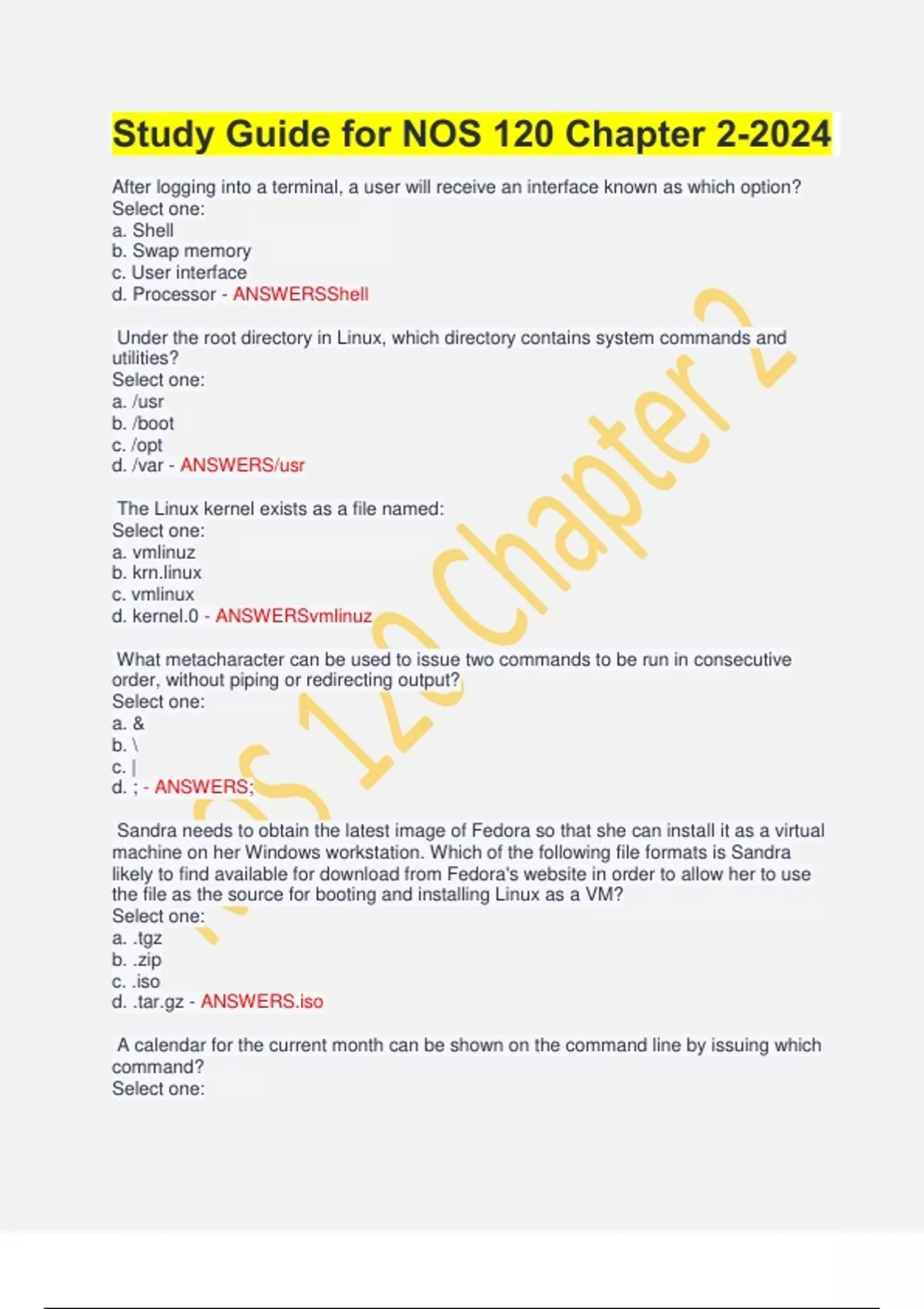 Study Guide for NOS 120 Chapter 2-2024 After logging into a terminal, a user will receive an interface known as which option? Select one: a. Shell b. Swap memory c. User interface d. Processor - ANSWERSShell Under the root directory in Linux, which directory contains system commands and utilities? Select one: a. /usr b. /boot c. /opt d. /var - ANSWERS/usr The Linux kernel exists as a file named: Select one: a. vmlinuz b. c. vmlinux d. kernel.0 - ANSWERSvmlinuz What metacharacter can be used to issue two commands to be run in consecutive order, without piping or redirecting output? Select one: a. & b. c. | d. ; - ANSWERS; Sandra needs to obtain the latest image of Fedora so that she can install it as a virtual machine on her Windows workstation. Which of the following file formats is Sandra likely to find available for download from Fedora's website in order to allow her to use the file as the source for booting and installing Linux as a VM? Select one: a. .tgz b. .zip c. .iso d. . - ANSWERS.iso A calendar for the current month can be shown on the command line by issuing which command? Select one: