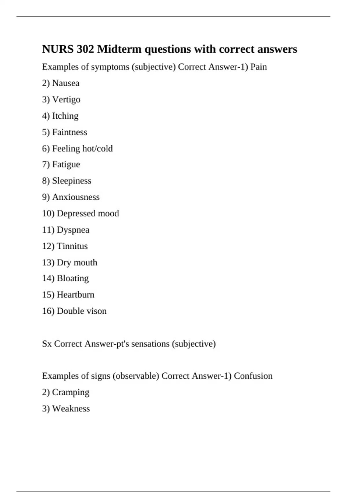 Examples of symptoms (subjective) Correct Answer-1) Pain