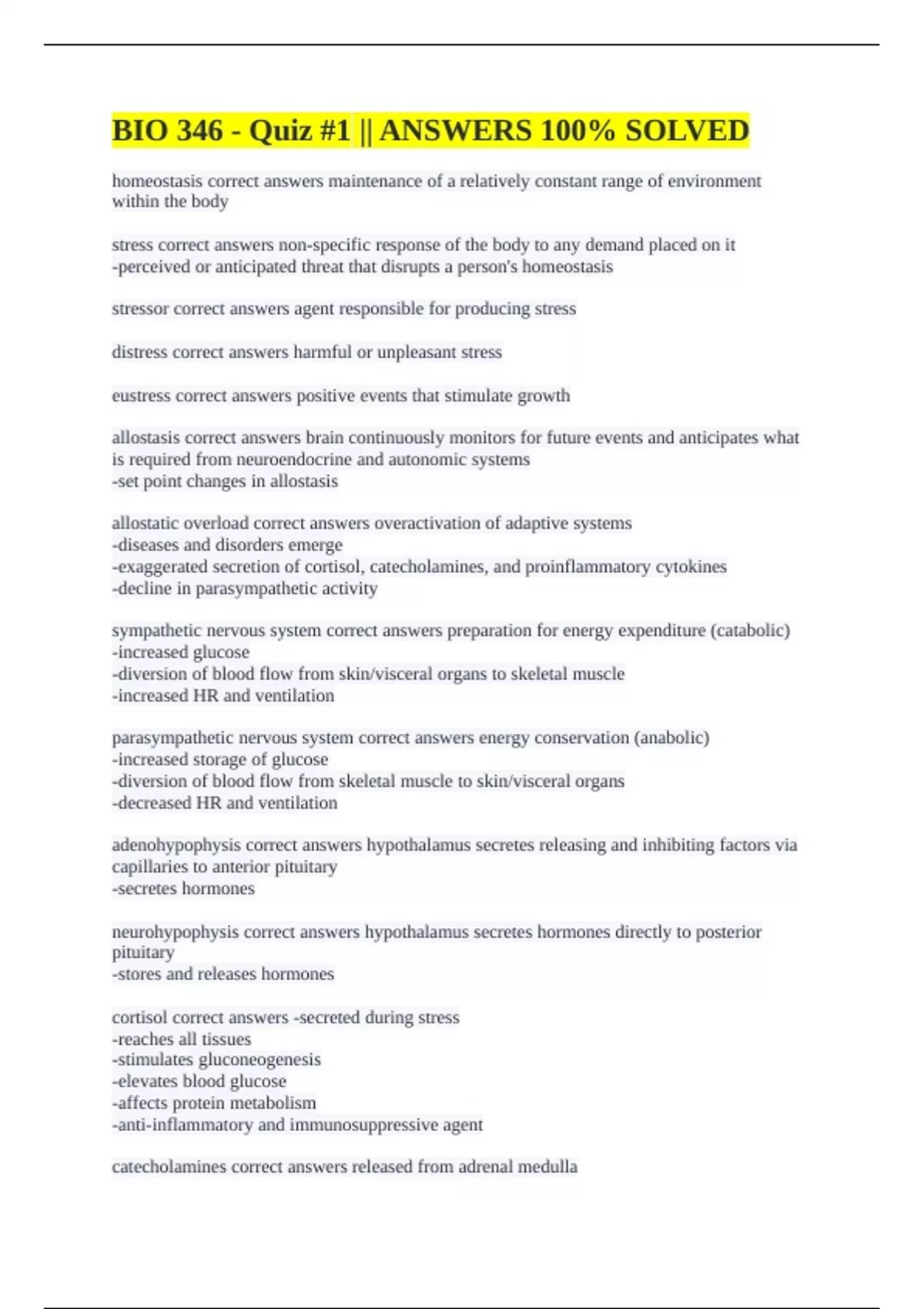 BIO 346 - Quiz #1 || ANSWERS 100% SOLVED