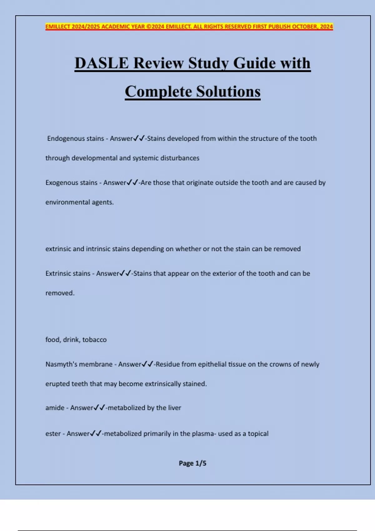 DASLE Review Study Guide with Complete Solutions Endogenous stains - Answer-Stains developed from within the structure of the tooth through developmental and systemic disturbances Exogenous stains - Answer-Are those that originate outside the tooth and are caused by environmental agents. extrinsic and intrinsic stains depending on whether or not the stain can be removed Extrinsic stains - Answer-Stains that appear on the exterior of the tooth and can be removed. food, drink, tobacco Nasmyth's membrane - Answer-Residue from epithelial tissue on the crowns of newly erupted teeth that may become extrinsically stained. amide - Answer-metabolized by the liver ester - Answer-metabolized primarily in the plasma- used as a topical EMILLECT 2024/2025 ACADEMIC YEAR ©2024 EMILLECT. ALL RIGHTS RESERVED FIRST PUBLISH OCTOBER, 2024 Page 2/5 local anesthesia contains - Answer--local anesthetic drug -sodium chloride- makes solution isotonic with body tissues -distilled water- supplies added water of solution concentrations levels of vasconstrictors - Answer-the smaller the ratio, the higher the percentage inferior alveolar nerve block - Answer-mandibular nerve block the larger the gauge - Answer-the smaller the needle the smaller the gauge - Answer-the larger the needle Plain Gut Suture - Answer-Absorable; provides fastest healing for mucous membranes and subcutaneous tissies Chromic gut suture - Answer-absorbable; provides slower heal thing process, allowing internal tissues to heal first Polyglactin 910 (Vicryl) - Answer-absorbable; synthetic material Silk suture - Answer-nonabsorable; strength and easy