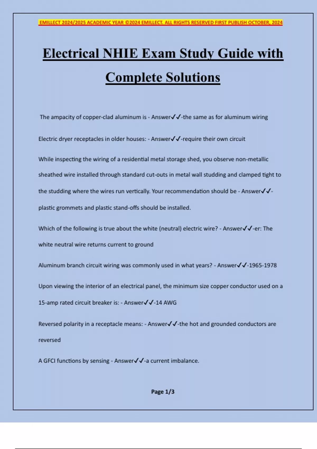 Electrical NHIE Exam Study Guide with Complete Solutions The ampacity of copper-clad aluminum is - Answer-the same as for aluminum wiring Electric dryer receptacles in older houses: - Answer-require their own circuit While inspecting the wiring of a residential metal storage shed, you observe non-metallic sheathed wire installed through standard cut-outs in metal wall studding and clamped tight to the studding where the wires run vertically. Your recommendation should be - Answer- plastic grommets and plastic stand-offs should be installed. Which of the following is true about the white (neutral) electric wire? - Answer-er: The white neutral wire returns current to ground Aluminum branch circuit wiring was commonly used in what years? - Answer- Upon viewing the interior of an electrical panel, the minimum size copper conductor used on a 15-amp rated circuit breaker is: - Answer-14 AWG Reversed polarity in a receptacle means: - Answer-the hot and grounded conductors are reversed A GFCI functions by sensing - Answer-a current imbalance. EMILLECT 2024/2025 ACADEMIC YEAR ©2024 EMILLECT. ALL RIGHTS RESERVED FIRST PUBLISH OCTOBER, 2024 Page 2/3 Three-hole grounding-type electrical receptacles: - Answer-must be grounded Which of the following is currently required to be GFCI protected? - Answer-Hydromassage tub When testing the GFCI test/reset device in the hall bathroom, you discover that the power shuts off to the outlets in the remaining bathrooms as well. You conclude - Answer-all these outlets are properly wired on the same GFCI protected circuit, and no correction is needed. GFCI protection is now required for - Answer-garage receptacles. Please refer to the figure to answer this question. The figure shows a fuse subpanel in an older house.