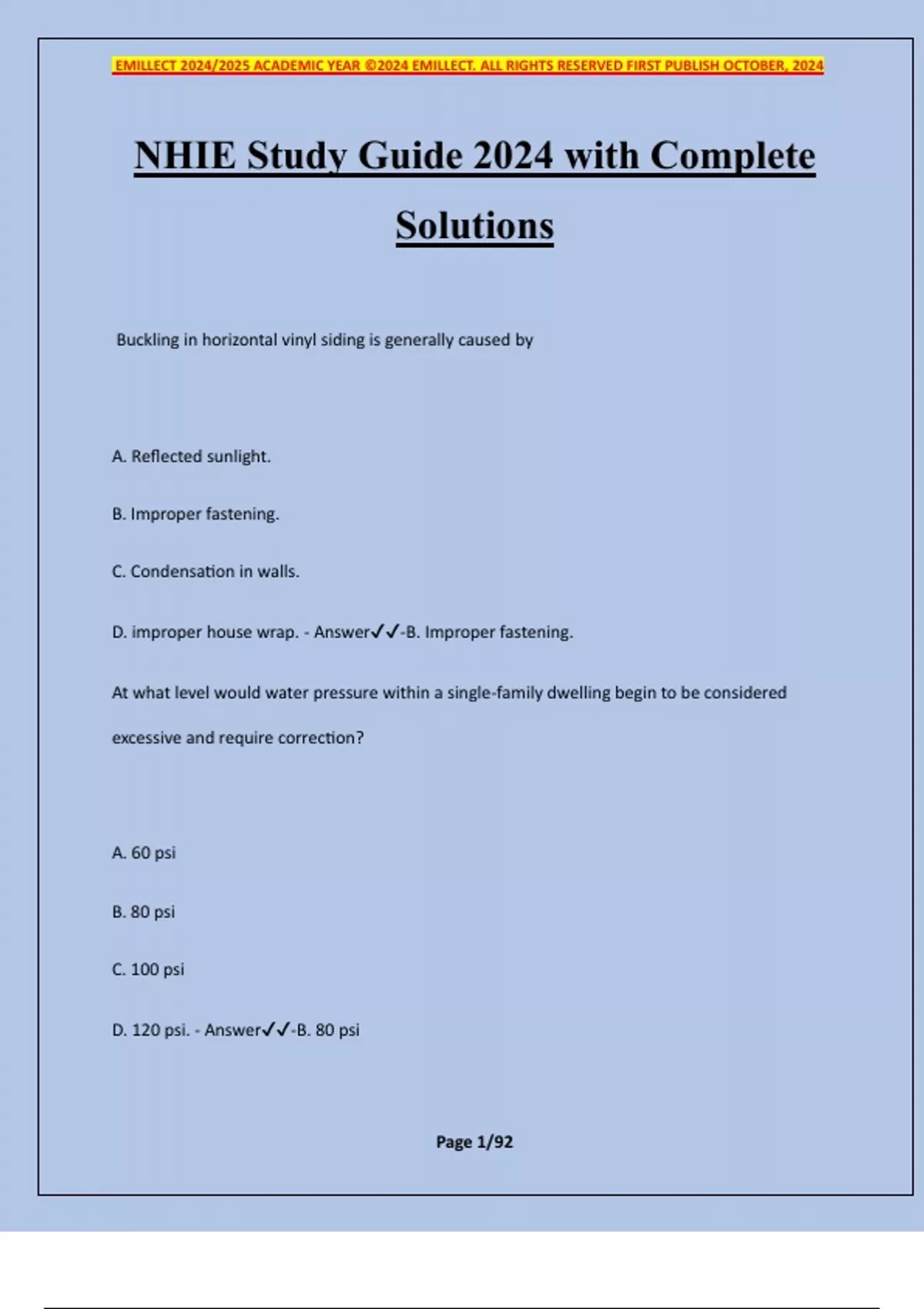 NHIE Study Guide 2024 with Complete Solutions Buckling in horizontal vinyl siding is generally caused by A. Reflected sunlight. B. Improper fastening. C. Condensation in walls. D. improper house wrap. - Answer-B. Improper fastening. At what level would water pressure within a single-family dwelling begin to be considered excessive and require correction? A. 60 psi B. 80 psi C. 100 psi D. 120 psi. - Answer-B. 80 psi EMILLECT 2024/2025 ACADEMIC YEAR ©2024 EMILLECT. ALL RIGHTS RESERVED FIRST PUBLISH OCTOBER, 2024 Page 2/92 A newer home with electric heat is being inspected. It has a below grade finished basement containing a bedroom, The inspector should look for a smoke alarm and A. An escape and rescue opening. B. carbon monoxide alarm. C. fire extinguisher. D. safety ladder. - Answer-A. An escape and rescue opening. A swimming pool fence must prevent passage of a sphere that is larger than A. 2 inches. B. 3 inches. C. 4 inches. D. 5 inches. - Answer-C. 4 inches. If water infiltration is suspected behind a finished surface. What tool would be the best choice to verify dampness? A. an infrared thermometer B. a pin-type moisture meter EMILLECT 2024/2025 ACADEMIC YEAR ©2024 EMILLECT. ALL RIGHTS RESERVED FIRST PUBLISH OCTOBER, 2024 Page 3/92 C. a non-contact moisture meter D. a digital camera - Answer-C. a non-contact moisture meter Gas-fired furnace heat exchangers most often fail from A. Low temperatures. B. Lack of use. C. Improper gas pressure. D. Rust and metal fatigue. - Answer-D. Rust and metal fatigue. Relative Humidity (RH) is expressed as A. volume. B. percentage. C. capacity. D. temperature. - Answer-B. percentage. Connections of dissimilar metal in plumbing system, such as galvanized steel pipe and copper pipe, will usually EMILLECT 2024/2025 ACADEMIC YEAR ©2024 EMILLECT. ALL RIGHTS RESERVED FIRST PUBLISH OCTOBER, 2024 Page 4/92 A. reduced water pressure B. decreased water quality C. Glazed pipes D. Electrolysis - Answer-D. Electrolysis A Ground fault circuit interrupter (GFCI) is a safety device that A. disconnects power when the grounding to the outlet is faulty. B. detects moisture and disconnects power in wet locations. C. disconnects the power when sensing current leakage to ground. D. protects against electrical surges and voltage spikes. - Answer-C. disconnects the power when sensing current leakage to ground. An electrical system with a fuse on the neutral condu