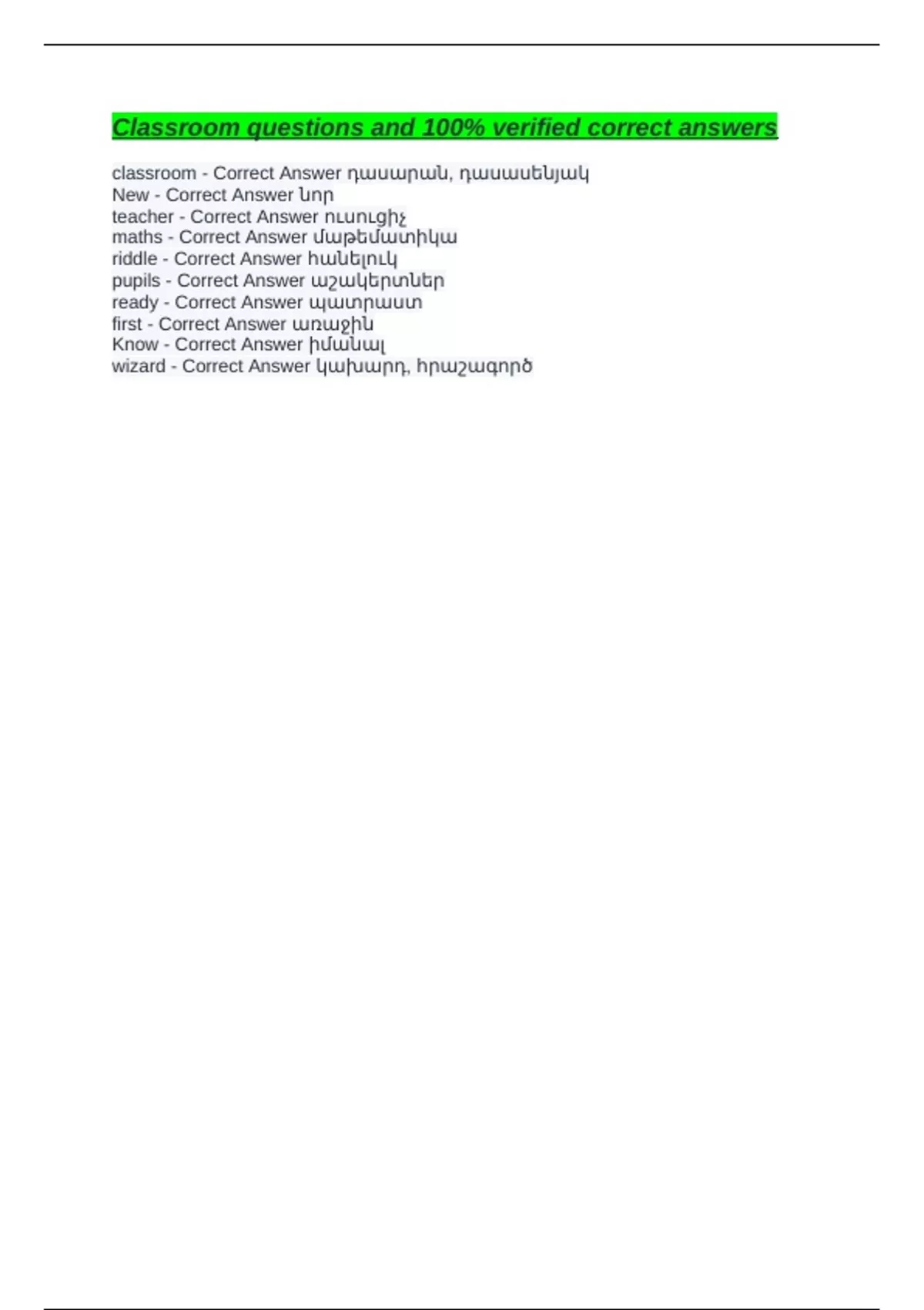 Classroom questions and 100% verified correct answers classroom - Correct Answer դասարան, դասասենյակ New - Correct Answer նոր teacher - Correct Answer ուսուցիչ maths - Correct Answer մաթեմատիկա riddle - Correct Answer հանելուկ pupils - Correct Answer աշակերտներ ready - Correct Answer պատրաստ first - Correct Answer առաջին Know - Correct Answer իմանալ wizard - Correct Answer կախարդ, հրաշագործ