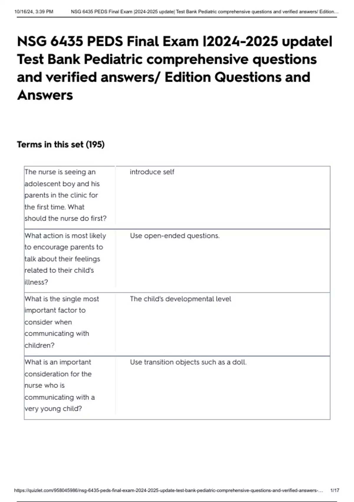 , 10/16/24, 3:39 PM NSG 6435 PEDS Final Exam |2024-2025 update| Test Bank Pediatric comprehensive questions and verified answers/ Edition…