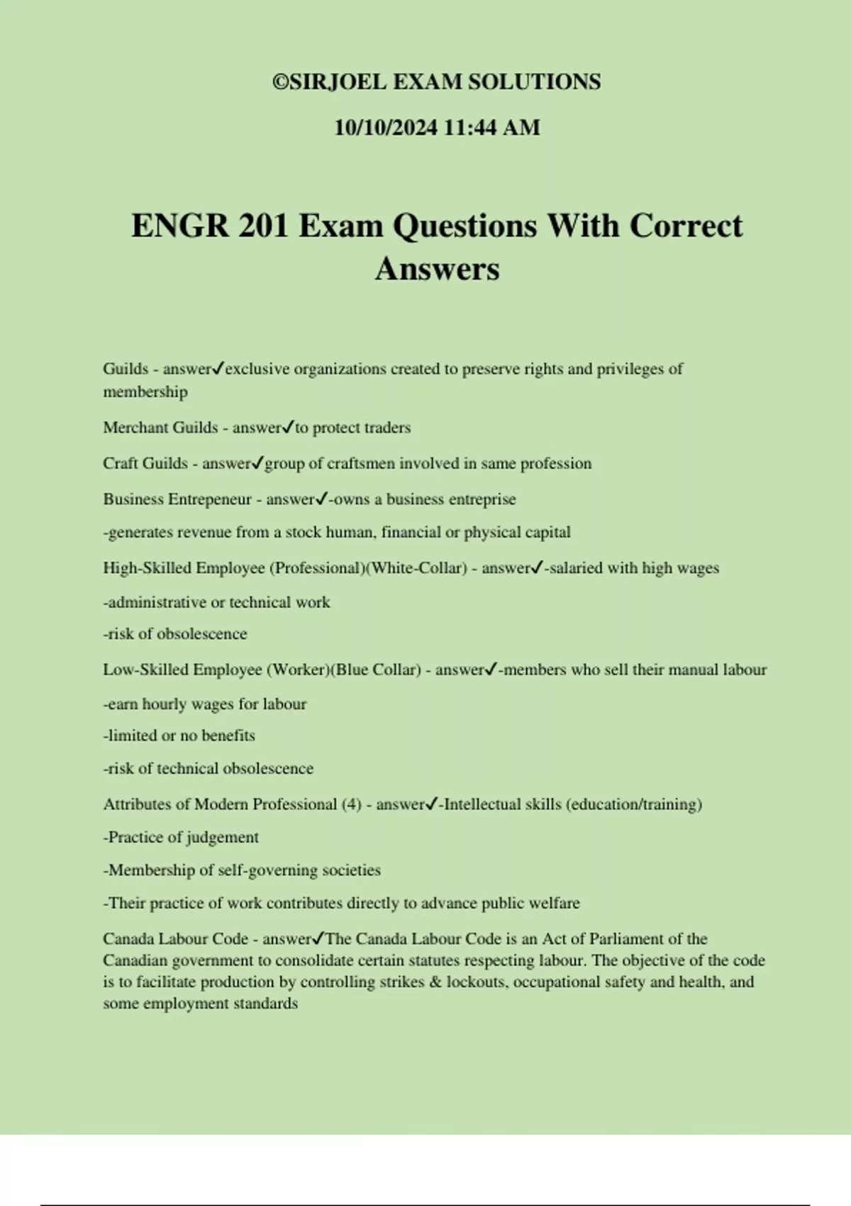 ENGR 201 Exam Questions With Correct Answers Guilds - answerexclusive organizations created to preserve rights and privileges of membership Merchant Guilds - answerto protect traders Craft Guilds - answergroup of craftsmen involved in same profession Business Entrepeneur - answer-owns a business entreprise -generates revenue from a stock human, financial or physical capital High-Skilled Employee (Professional)(White-Collar) - answer-salaried with high wages -administrative or technical work -risk of obsolescence Low-Skilled Employee (Worker)(Blue Collar) - answer-members who sell their manual labour -earn hourly wages for labour -limited or no benefits -risk of technical obsolescence Attributes of Modern Professional (4) - answer-Intellectual skills (education/training) -Practice of judgement -Membership of self-governing societies -Their practice of work contributes directly to advance public welfare Canada Labour Code - answerThe Canada Labour Code is an Act of Parliament of the Canadian government to consolidate certain statutes respecting labour. The objective of the code is to facilitate production by controlling strikes & lockouts, occupational safety and health, and some employment standards ©SIRJOEL EXAM SOLUTIONS 10/10/2024 11:44 AM Independent Professionals - answer-work independently (get paid directly by client for their services) -much greater autonomy ex: engineer, private Dr, architect Employed Professionals - answer-hired by a company or organization -monthly salary -less autonomy -employer sets terms of work ex: nurse, manufacturing engineer Professional System (3 key aspects) - answer1. Formal rules/ laws that govern the actions of individual professionals 2. Receive a license to practice the profession 3. Breaking rules results on penalties depending on gravity. Can even lose license. (governed by government) Professional Values (2) - answer1.Guide the nature of professional relations with clients, employers (honesty, integrity, loyalty, responsibility) 2.Related to social leadership that relates how the professional should relate to the values that underpin a particular society (law, prejudice, safety) Conflict of Interest - answera conflict between self-interest and professional obligation Role of Professions in Society - answer1. Society values professionals for their skill and expertise 2. Society values professionals bc their technical expertise can guide important decisions that society can't make collectively Professional System in Canada - answer1. Control over individual professionals. Associations are strengthened by power of the law passed by the respective provincial legislative assembly 2. In order to practice, the professional has to become a member of the corresponding professional association (license) 3. Follows social contract model (more emphasis on member responsibilities rather than rights,