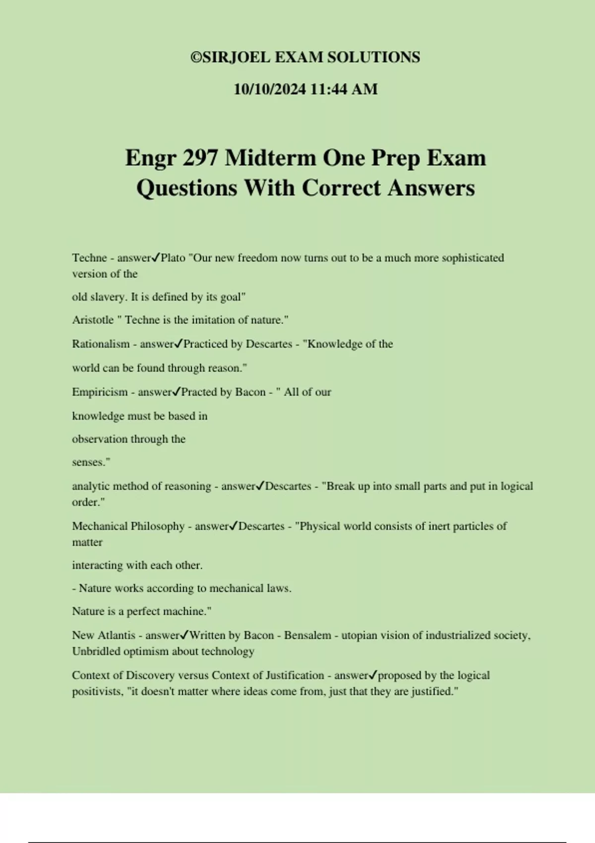 Engr 297 Midterm One Prep Exam Questions With Correct Answers Techne - answerPlato "Our new freedom now turns out to be a much more sophisticated version of the old slavery. It is defined by its goal" Aristotle " Techne is the imitation of nature." Rationalism - answerPracticed by Descartes - "Knowledge of the world can be found through reason." Empiricism - answerPracted by Bacon - " All of our knowledge must be based in observation through the senses." analytic method of reasoning - answerDescartes - "Break up into small parts and put in logical order." Mechanical Philosophy - answerDescartes - "Physical world consists of inert particles of matter interacting with each other. - Nature works according to mechanical laws. Nature is a perfect machine." New Atlantis - answerWritten by Bacon - Bensalem - utopian vision of industrialized society, Unbridled optimism about technology Context of Discovery versus Context of Justification - answerproposed by the logical positivists, "it doesn't matter where ideas come from, just that they are justified." ©SIRJOEL EXAM SOLUTIONS 10/10/2024 11:44 AM Paradigms - answer1) a set of theoretical assumptions that all members of the scientific community accept. • 2) a set of 'exemplars' or scientific problems that have been solved using those assumptions (i.e. textbook problems) • 3) idea of how future research should proceed • 4) idea of what problems are important to tackle • 5) idea of what acceptable answers will look like. Dialectic (Socrataic and Hegelian) - answerSocrataic Process of argumentation and refutation used to discover the truth. Used to clear away misconceptions and arrive at first principles. Hegelian The Geist evolves much like an argument does. A society has an idea about the world(the thesis). The thesis leads to obvious contradictions and this leads to an antithesis. From both of these, society adopts a synthesis (a combination of both ideas). Democratic and Authoritarian Technologies - answerThe idea that certain technologies fit better in democratic or authoritarian systems. Technological Unemployment - answerLoss of jobs due to improvement in technology Race between the inventor and the stork - answerInventing enough to prepare for the inevitable population growth Technologies that are political by design - answerDesigns created to have a political affect Inherently political technologies - answerTechnologies that create politics just by existing Anomalies - answerPhenomena that simply cannot be reconciled with the theoretical assumptions of the paradigm ©SIR