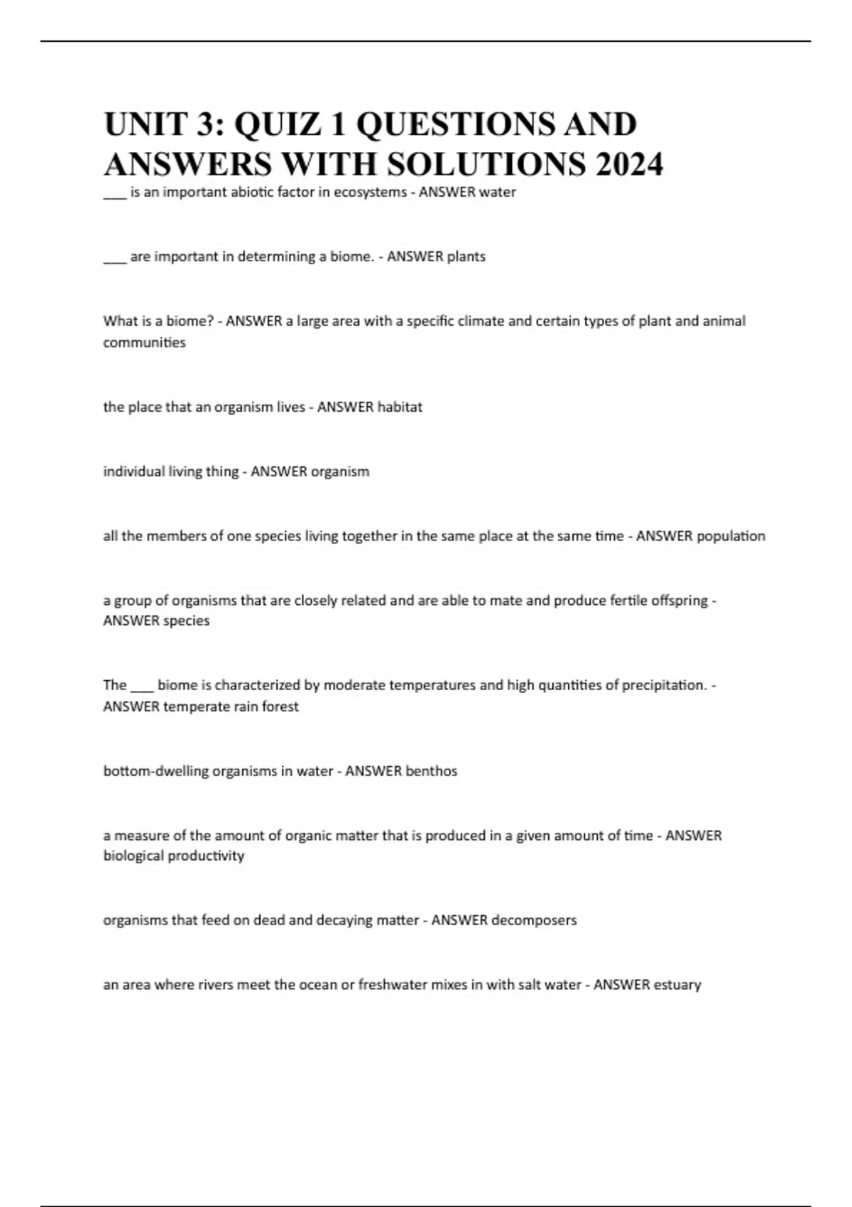 What is a biome? - ANSWER a large area with a specific climate and certain types of plant and animal