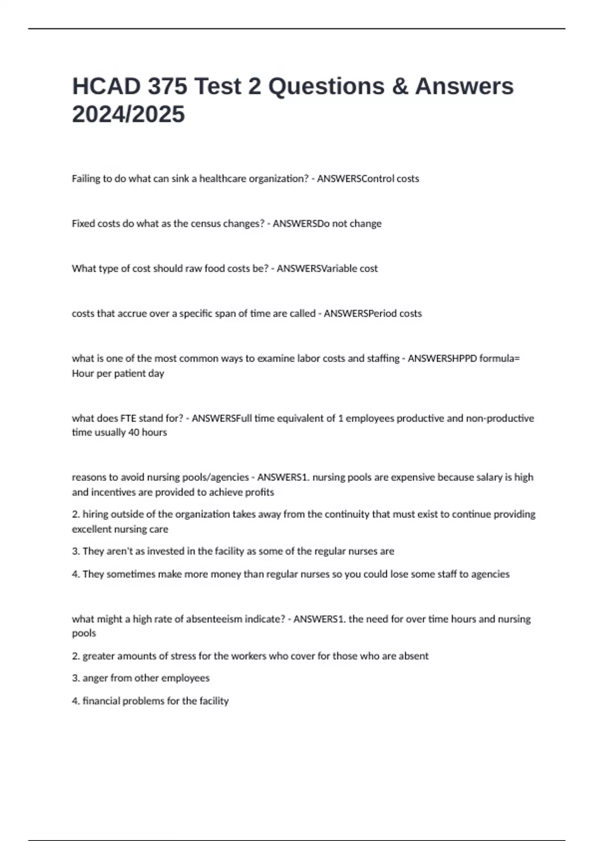 what might a high rate of absenteeism indicate? - ANSWERS1. the need for over time hours and nursing