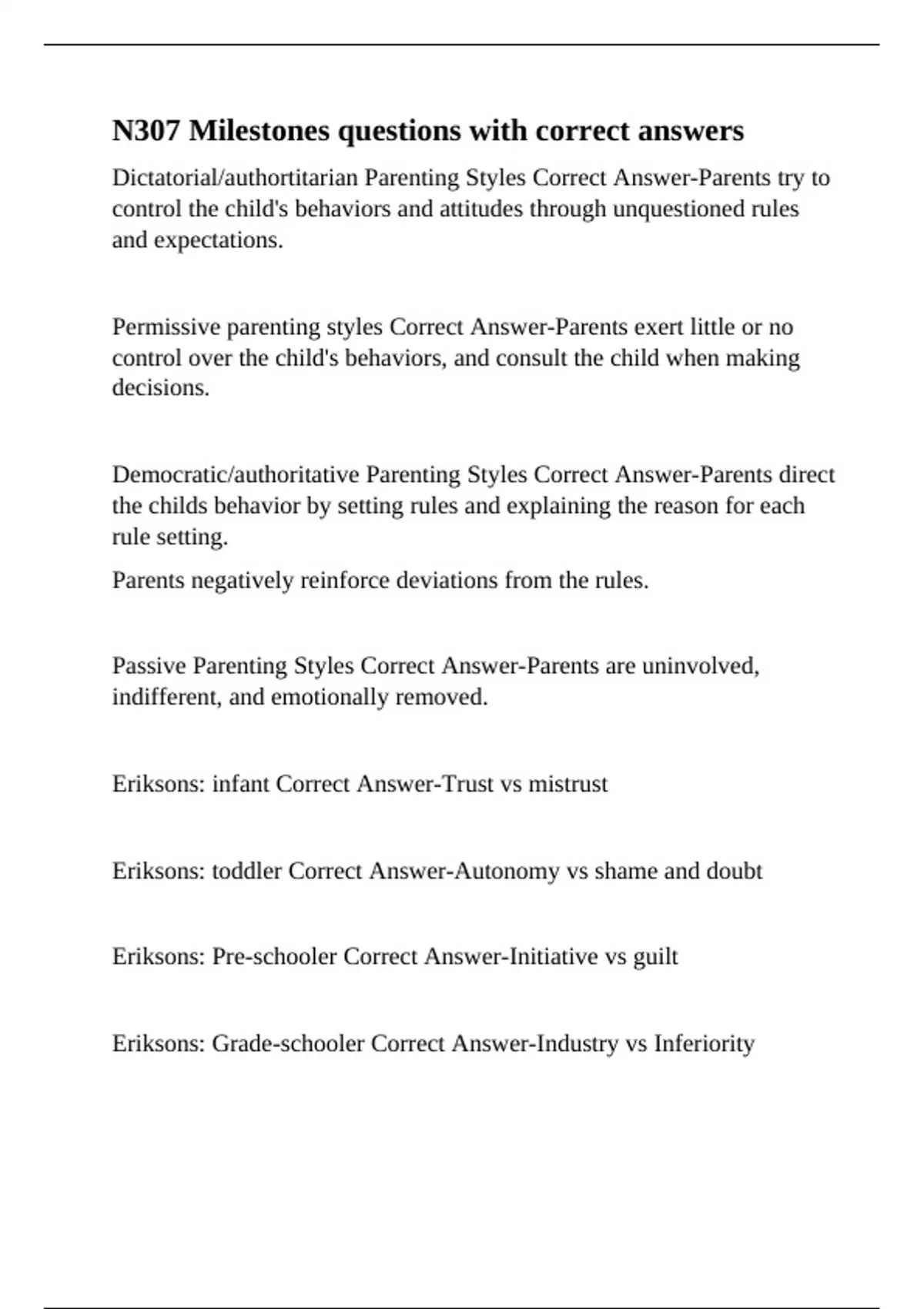 Eriksons: infant Correct Answer-Trust vs mistrust