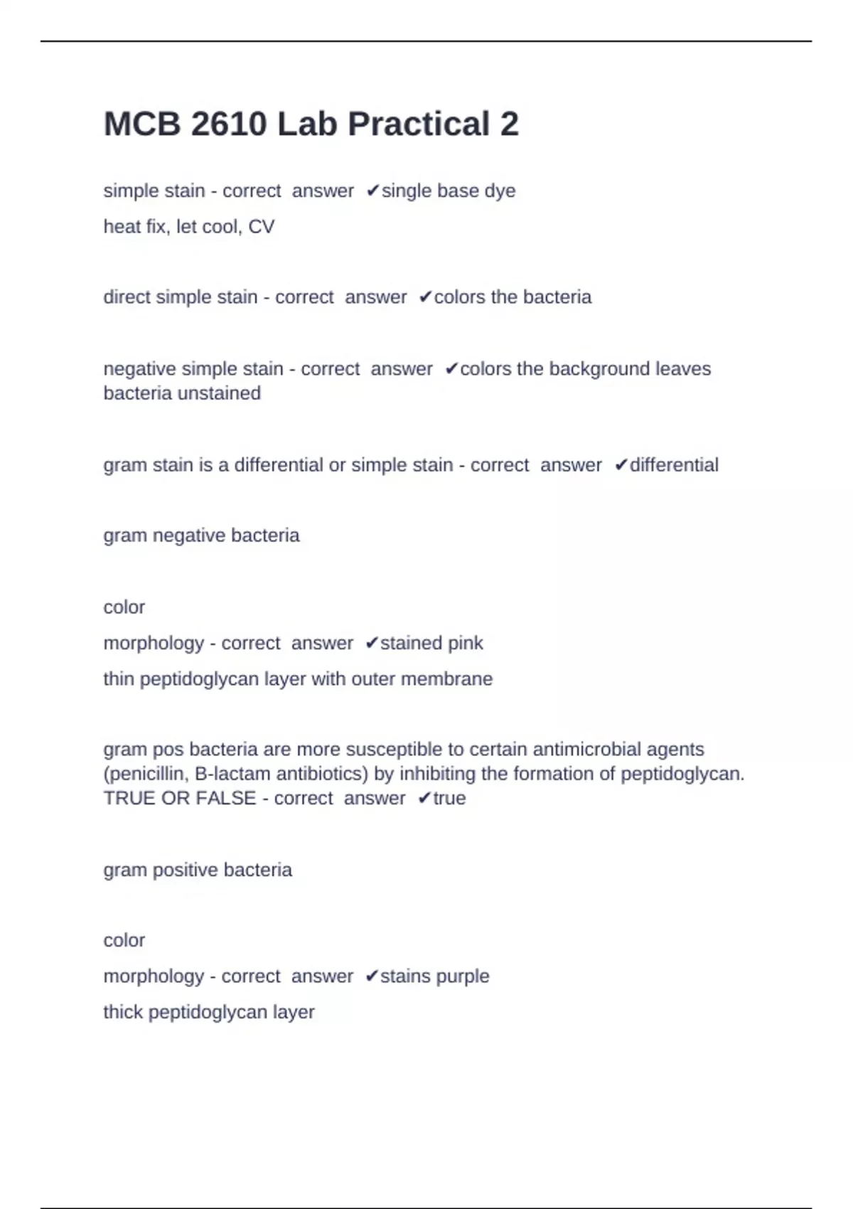 MCB 2610 Lab Practical 2 Question and answers correctly solved 2024/2025 MCB 2610 Lab Practical 2 simple stain - correct answer single base dye heat fix, let cool, CV direct simple stain - correct answer colors the bacteria negative simple stain - correct answer colors the background leaves bacteria unstained gram stain is a differential or simple stain - correct answer differential gram negative bacteria color morphology - correct answer stained pink thin peptidoglycan layer with outer membrane gram pos bacteria are more susceptible to certain antimicrobial agents (penicillin, B-lactam antibiotics) by inhibiting the formation of peptidoglycan. TRUE OR FALSE - correct answer true gram positive bacteria color morphology - correct answer stains purple thick peptidoglycan layer