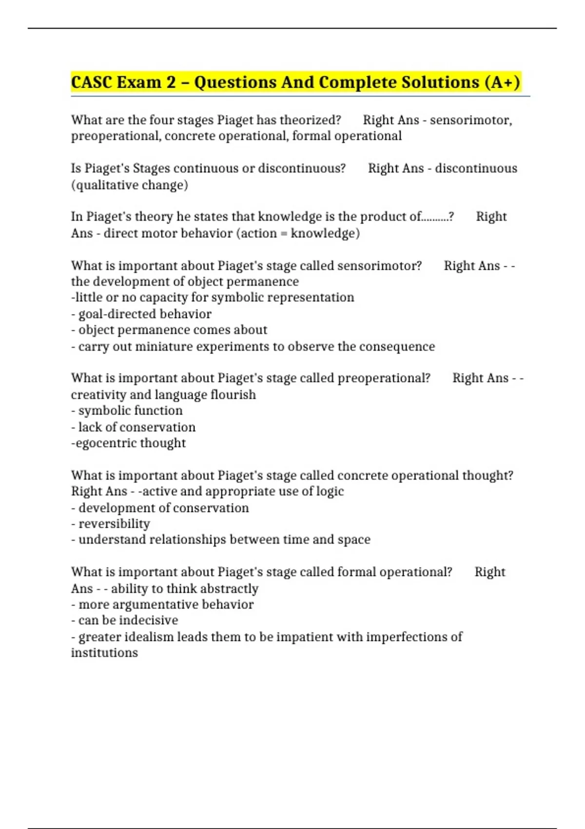 What is important about Piaget's stage called sensorimotor? Right Ans - -