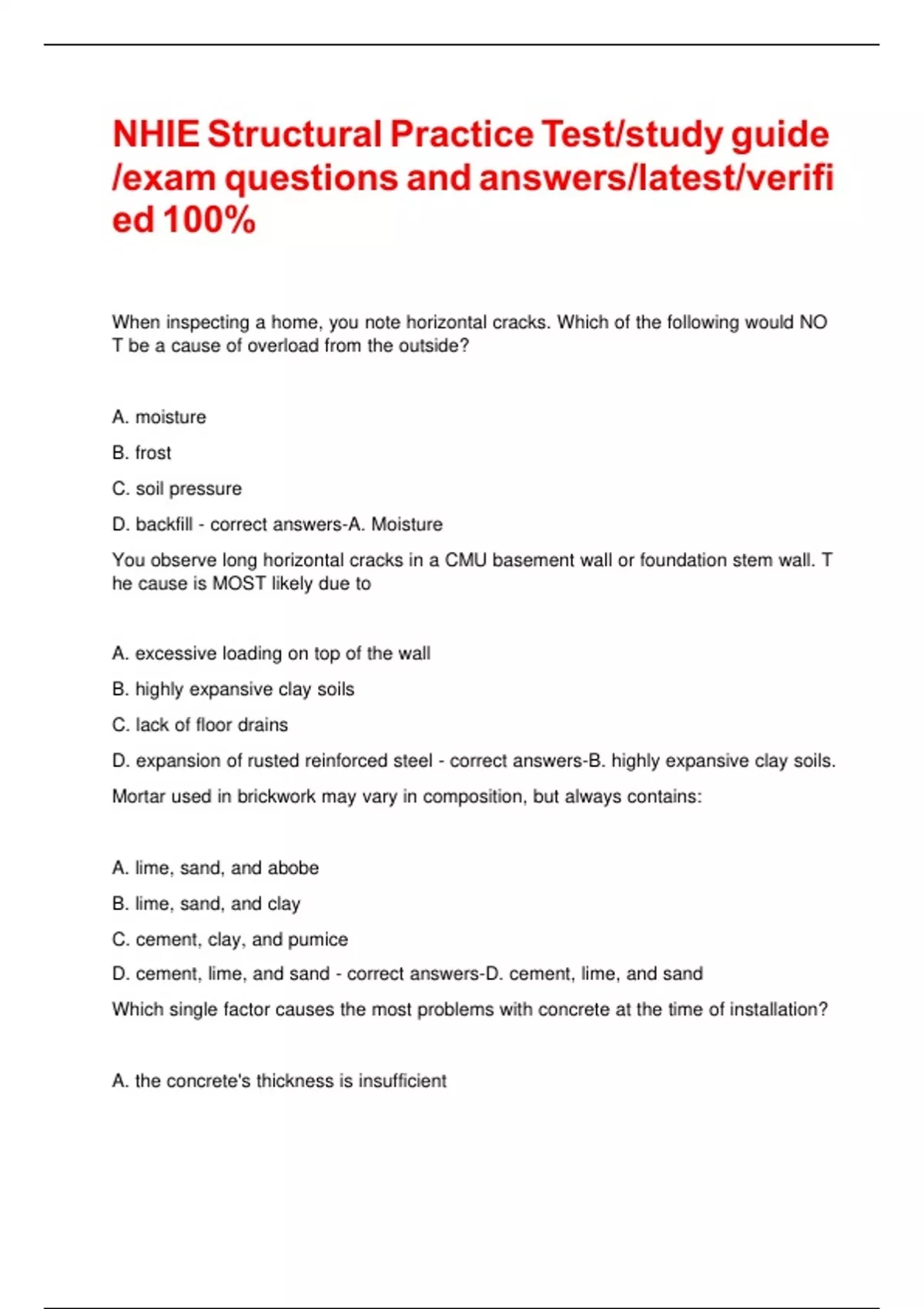 NHIE Structural Practice Test/study guide/exam questions and answers/latest/verified 100% NHIE Structural Practice Test/study guide/exam questions and answers/latest/verified 100% When inspecting a home, you note horizontal cracks. Which of the following would NOT be a cause of overload from the outside? A. moisture B. frost C. soil pressure D. backfill - correct answers-A. Moisture You observe long horizontal cracks in a CMU basement wall or foundation stem wall. The cause is MOST likely due to A. excessive loading on top of the wall B. highly expansive clay soils C. lack of floor drains D. expansion of rusted reinforced steel - correct answers-B. highly expansive clay soils. Mortar used in brickwork may vary in composition, but always contains: A. lime, sand, and abobe B. lime, sand, and clay C. cement, clay, and pumice D. cement, lime, and sand - correct answers-D. cement, lime, and sand Which single factor causes the most problems with concrete at the time of installation? A. the concrete's thickness is insufficient B. too much water is added C. too much portland cement is in the mix D. the wrong kind of sand is in the mix - correct answers-B. Too much water is added. Bowing in a foundation wall is usually the result of A. vertical forces B. lateral forces C. settement D. spalling - correct answers-B. lateral forces. In a 1987 conventional wood-frame house, which one of the following signs (by itself) is a significant problem?