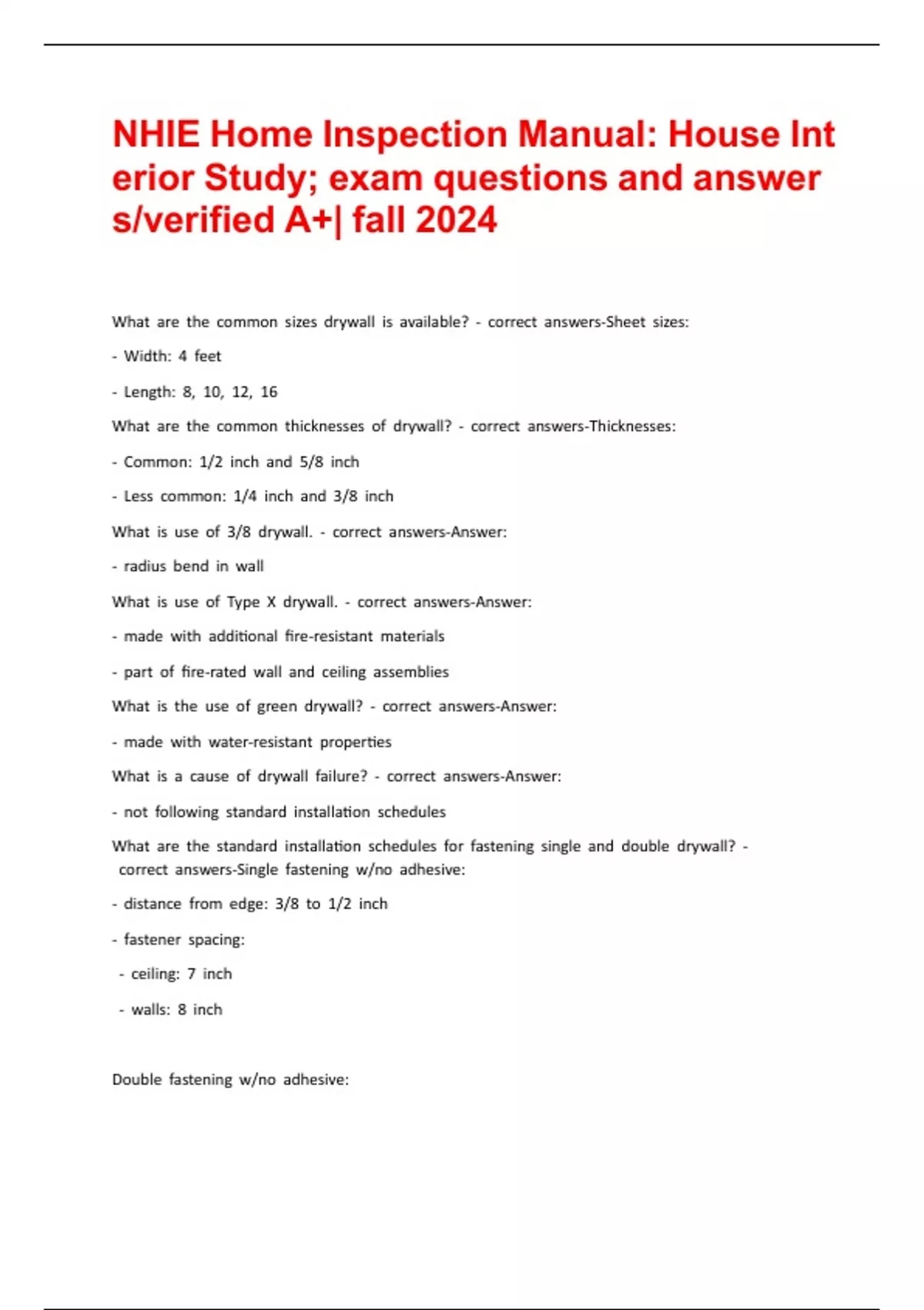 NHIE Home Inspection Manual: House Interior Study; exam questions and answers/verified A+| fall 2024NHIE Home Inspection Manual: House Interior Study; exam questions and answers/verified A+| fall 2024 What are the common sizes drywall is available? - correct answers-Sheet sizes: - Width: 4 feet - Length: 8, 10, 12, 16 What are the common thicknesses of drywall? - correct answers-Thicknesses: - Common: 1/2 inch and 5/8 inch - Less common: 1/4 inch and 3/8 inch What is use of 3/8 drywall. - correct answers-Answer: - radius bend in wall What is use of Type X drywall. - correct answers-Answer: - made with additional fire-resistant materials - part of fire-rated wall and ceiling assemblies What is the use of green drywall? - correct answers-Answer: - made with water-resistant properties What is a cause of drywall failure? - correct answers-Answer: - not following standard installation schedules What are the standard installation schedules for fastening single and double drywall? - correct answers-Single fastening w/no adhesive: - distance from edge: 3/8 to 1/2 inch - fastener spacing: - ceiling: 7 inch - walls: 8 inch Double fastening w/no adhesive: - distance from edge: 3/8 to 1/2 inch - fastener spacing: 12 inches - spacing between doubled fasteners: 2 to 2 1/2 inches What is the process of applying interior plaster? - correct answers-Process - plaster is a combination of line, gypsum, or cement - an aggregate is added (e.g., sand, vermiculite, or perlite) - plater is applied over wood lath (i.e., closely spaced wood boards - lath provides structural support and stability - plaster application is identical to 3-coat exterior stucco application (e.g., scratch, brown, & finish coat) Note: - plater dries rock hard - less prone to cracking than drywall - will crack due to significant movement or physical damage - plaster cracks are commonly caused by lath separating from framing Can wood paneling be installed as an interior finish in a garage? - correct answers-Answer: - No, paneling cannot be installed in a garage because it does not provide fire separation. What is a suspended ceiling? Where is a suspended ceiling used? And, why is a suspended ceiling used? - correct answers-What: - System consisting of meta