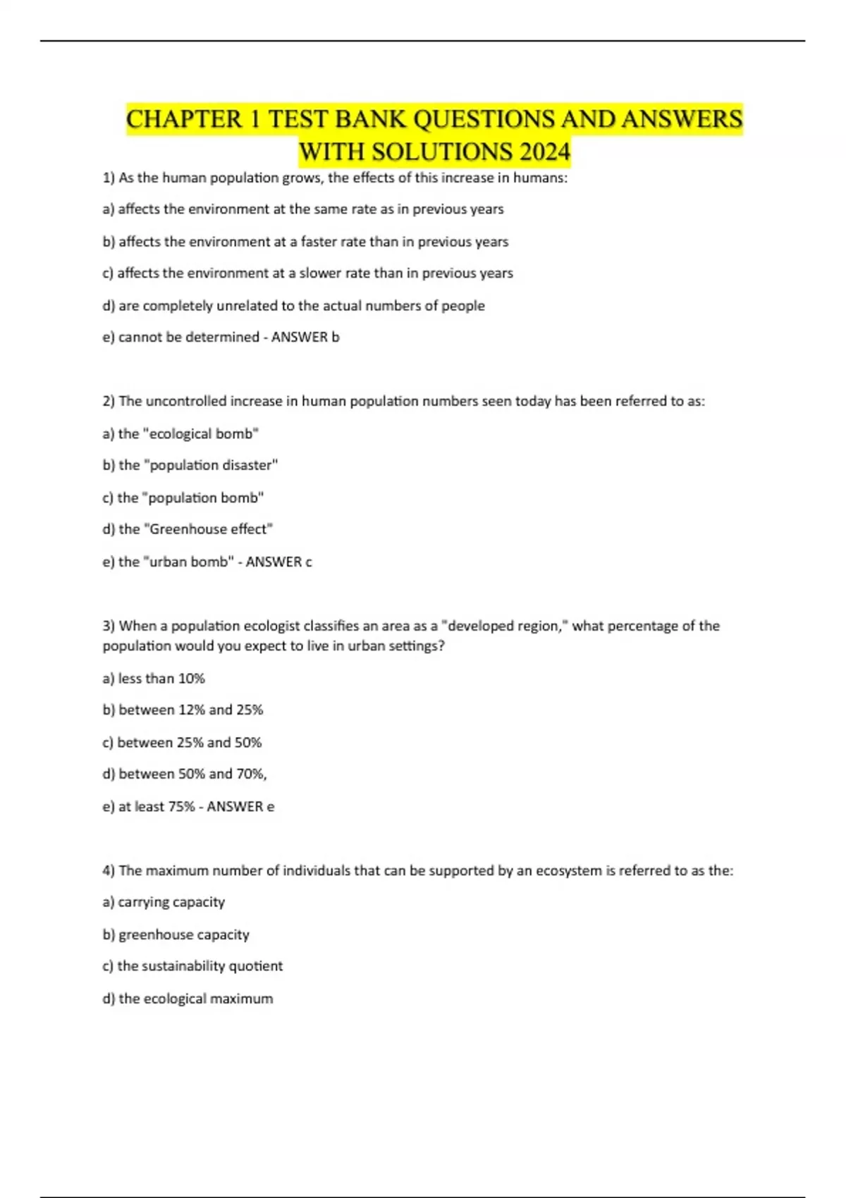 CHAPTER 1 TEST BANK QUESTIONS AND ANSWERS WITH SOLUTIONS 2024 1) As the human population grows, the effects of this increase in humans: a) affects the environment at the same rate as in previous years b) affects the environment at a faster rate than in previous years c) affects the environment at a slower rate than in previous years d) are completely unrelated to the actual numbers of people e) cannot be determined - ANSWER b 2) The uncontrolled increase in human population numbers seen today has been referred to as: a) the "ecological bomb" b) the "population disaster" c) the "population bomb" d) the "Greenhouse effect" e) the "urban bomb" - ANSWER c 3) When a population ecologist classifies an area as a "developed region," what percentage of the population would you expect to live in urban settings? a) less than 10% b) between 12% and 25% c) between 25% and 50% d) between 50% and 70%, e) at least 75% - ANSWER e 4) The maximum number of individuals that can be supported by an ecosystem is referred to as the: a) carrying capacity b) greenhouse capacity c) the sustainability quotient d) the ecological maximum e) the resource capacity - ANSWER a 5) According to the Environmental Science text, if recent human population growth rates continue, our number will reach approximately 9.4 billion by: a) 2020 b) 2030 c) 2040 d) 2050 e) 2060 - ANSWER d 6) The proposal that life has profoundly changed the global environment, and that these changes have tended to improve the chances for the continuation of life is referred to as: a) the greenhouse hypothesis b) the Gaia hypothesis c) the carrying capacity hypothesis d) the biological hypothesis e) the ecological hypothesis - ANSWER b 7) According to the Environmental Science text, nearly 6 million children die each year due to the effects of: a) cancer b) parasitic diseases c) dirty water d) predatory animals e) malnutrition - ANSWER e 8) Justification that argues to preserve some aspect of the environment because of our appreciation of the beauty of nature and our desire to get out and enjoy it: a) utilitarian b) ecological c) moral d)