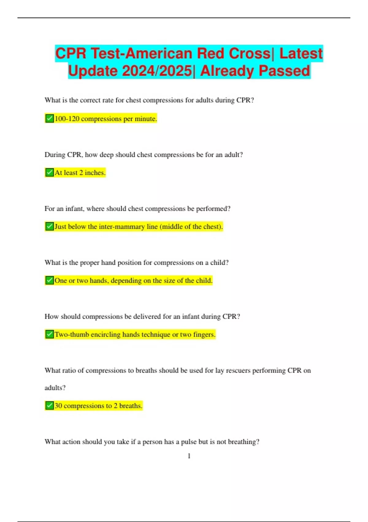 CPR Test-American Red Cross| Latest Update 2024/2025| Already Passed What is the correct rate for chest compressions for adults during CPR? 100-120 compressions per minute. During CPR, how deep should chest compressions be for an adult? At least 2 inches. For an infant, where should chest compressions be performed? Just below the inter-mammary line (middle of the chest). What is the proper hand position for compressions on a child? One or two hands, depending on the size of the child. How should compressions be delivered for an infant during CPR? Two-thumb encircling hands technique or two fingers. What ratio of compressions to breaths should be used for lay rescuers performing CPR on adults? 30 compressions to 2 breaths. What action should you take if a person has a pulse but is not breathing? 2 Provide 1 rescue breath every 6 seconds. How long should each rescue breath last for an adult during CPR? 1 second per breath, enough to make the chest rise visibly. How often should pulse checks be done during CPR? Only when signs of return of spontaneous circulation (ROSC) appear. What is the compression depth for children during CPR? At least one-third the depth of the chest, about 2 inches. When should CPR be paused for rhythm analysis? After every 2 minutes of compressions. What is the compression depth for an infant during CPR? About 1.5 inches or one-third the depth of the chest. What technique should healthcare professionals use for children’s CPR when there are two rescuers? A compression-to-ventilation ratio of 15:2. 3 How many rescue breaths per minute should be provided for a child or infant with a pulse but insufficient breathing? 1 breath every 2-3 seconds. What should be done immediately after a shock is delivered by an AED? Resume CPR for 2 minutes before checking the rhythm again. How can you minimize the risk of fatigue during chest compressions? Switch roles every 2 minutes or after 5 cycles of compressions and breaths. What is the purpose of allowing full chest recoil during compressions? To allow the heart to refill with blood between compressions. Why is it important to minimize interruptions during chest compres