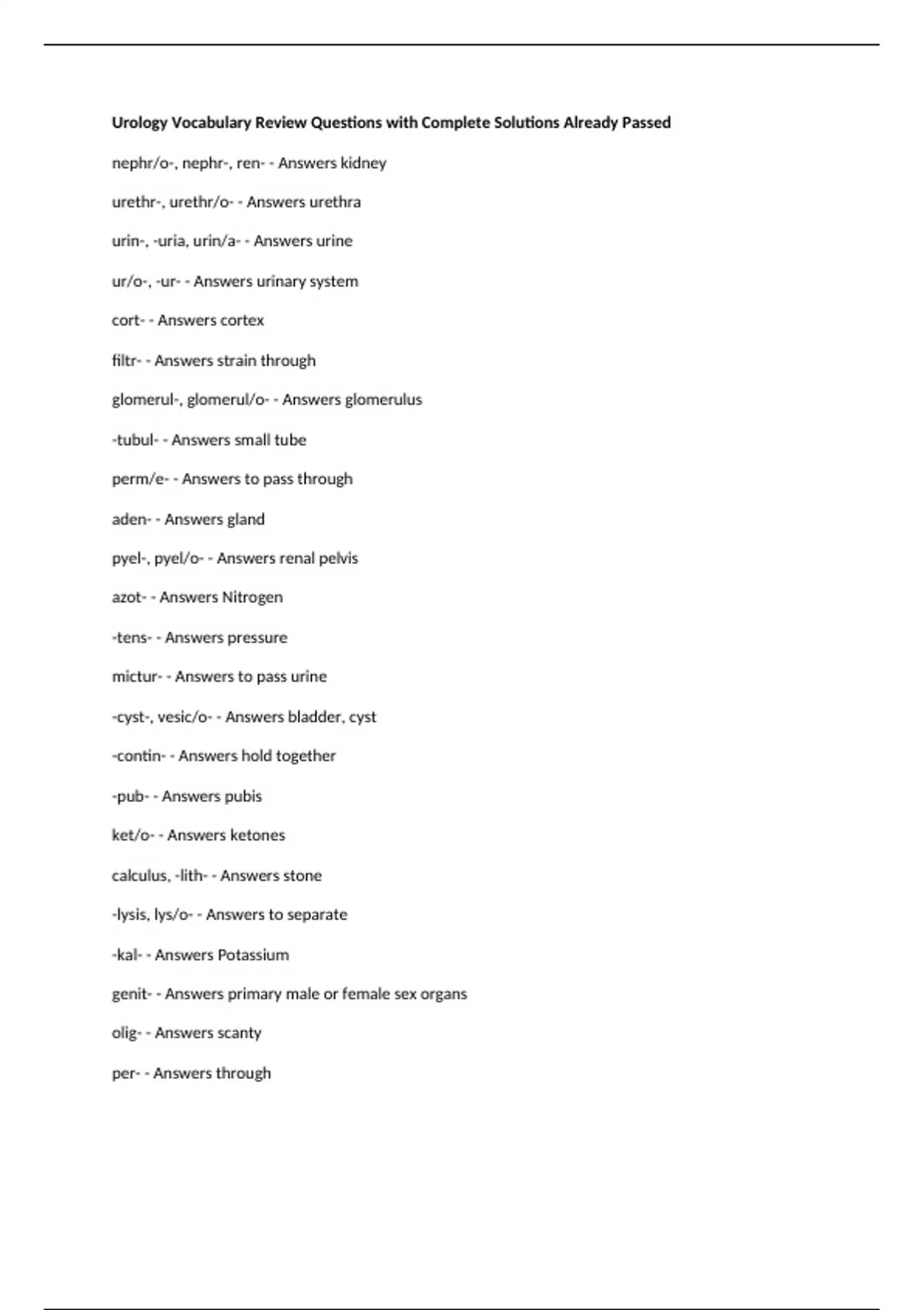 Urology Vocabulary Review Questions with Complete Solutions Already Passed nephr/o-, nephr-, ren- - Answers kidney urethr-, urethr/o- - Answers urethra urin-, -uria, urin/a- - Answers urine ur/o-, -ur- - Answers urinary system cort- - Answers cortex filtr- - Answers strain through glomerul-, glomerul/o- - Answers glomerulus -tubul- - Answers small tube perm/e- - Answers to pass through aden- - Answers gland pyel-, pyel/o- - Answers renal pelvis azot- - Answers Nitrogen -tens- - Answers pressure mictur- - Answers to pass urine -cyst-, vesic/o- - Answers bladder, cyst