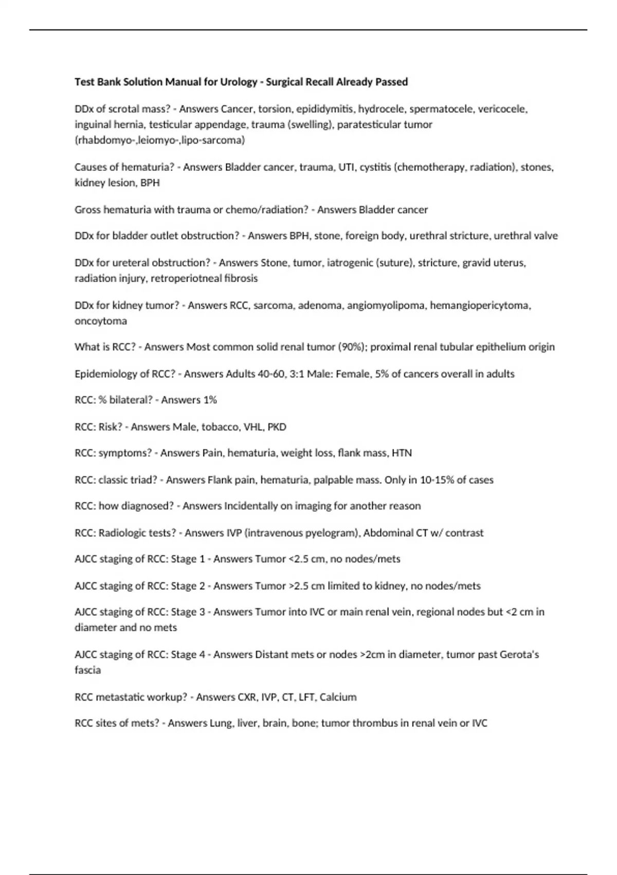 Test Bank Solution Manual for Urology - Surgical Recall Already Passed DDx of scrotal mass? - Answers Cancer, torsion, epididymitis, hydrocele, spermatocele, vericocele, inguinal hernia, testicular appendage, trauma (swelling), paratesticular tumor (rhabdomyo-,leiomyo-,lipo-sarcoma) Causes of hematuria? - Answers Bladder cancer, trauma, UTI, cystitis (chemotherapy, radiation), stones, kidney lesion, BPH Gross hematuria with trauma or chemo/radiation? - Answers Bladder cancer DDx for bladder outlet obstruction? - Answers BPH, stone, foreign body, urethral stricture, urethral valve DDx for ureteral obstruction? - Answers Stone, tumor, iatrogenic (suture), stricture, gravid uterus, radiation injury, retroperiotneal fibrosis DDx for kidney tumor? - Answers RCC, sarcoma, adenoma, angiomyolipoma, hemangiopericytoma, oncoytoma What is RCC? - Answers Most common solid renal tumor (90%); proximal renal tubular epithelium origin Epidemiology of RCC? - Answers Adults 40-60, 3:1 Male: Female, 5% of cancers overall in adults RCC: % bilateral? - Answers 1% RCC: Risk? - Answers Male, tobacco, VHL, PKD RCC: symptoms? - Answers Pain, hematuria, weight loss, flank mass, HTN RCC: classic triad? - Answers Flank pain, hematuria, palpable mass. Only in 10-15% of cases RCC: how diagnosed? - Answers Incidentally on imaging for another reason RCC: Radiologic tests? - Answers IVP (intravenous pyelogram), Abdominal CT w/ contrast AJCC staging of RCC: Stage 1 - Answers Tumor <2.5 cm, no nodes/mets AJCC staging of RCC: Stage 2 - Answers Tumor >2.5 cm limited to kidney, no nodes/mets AJCC staging of RCC: Stage 3 - Answers Tumor into IVC or main renal vein, regional nodes but <2 cm in diameter and no mets AJCC staging of RCC: Stage 4 - Answers Distant mets or nodes >2cm in diameter, tumor past Gerota's fascia RCC metastatic workup? - Answers CXR, IVP, CT, LFT, Calcium RCC sites of mets? - Answers Lung, liver, brain, bone; tumor thrombus in renal vein or IVC RCC: unique route of spread? - Answers Tumor thrombus through IVC RCC treatment? - Answers Radical nephrectomy (kidney, adrenal, Gerota's), stages I through IV What gland is included in a radical nephrectomy? - Answers Adrenal RCC: Unique treatment for metastatic spread? - Answers 1. alpha interferon 2. LAK cells (lymphokine-activated killer) and IL-2 RCC + liver disease? - Answers Stauffer's syndrome Concern in an adult with new onset left varicocele? - Answers Left RCC - left gonadal vein drains into left renal vein Bladder cancer: incidence? - Answers Second most common urologic malignancy, M:F 3:1, White > AA Bladder cancer: most common histology? - Answers Transitional/urothelial cell carcinoma (TCC)>> squamous, adenocarcinoma Bladder ca: risk factors? - Answers Smoking >> industrial carciogens (aromatic amines), schisto, truck drivers, petroleum workers, cyclophosphamide Bladder ca: symptoms? - Answers Hematuria +/- irritation (dysuria), frequency Bladder ca: classic presentation? - Answers Painless hematuria Bladder ca: workup? - Answers Urinalysis, culture, IVP, cystoscopy + cytology, biopsy Bladder ca TCC: Stage 0 - Answers Superficial, CIS Bladder ca TCC: Stage 1 - Answers Invades subepithelial connective tissue, no nodes/mets Bladder ca TCC: Stage 2 - Answers Invades superficial or deep muscularis propria, no nodes/mets Bladder ca TCC: Stage 3 - Answers Invades perivesical tissues, no nodes/mets Bladder ca TCC: Stage 4 - Answers Nodal spread with distant mets and/or invades abdominal/pelvic wall Bladder ca TCC: Stage 0 Treatment - Answers TURB, intravesical chemotherapy Bladder ca TCC: Stage 1 Treatment - Answers TURB Bladder ca TCC: Stage 2/3 Treatment - Answers Radical cystectomy, lymph node dissection,