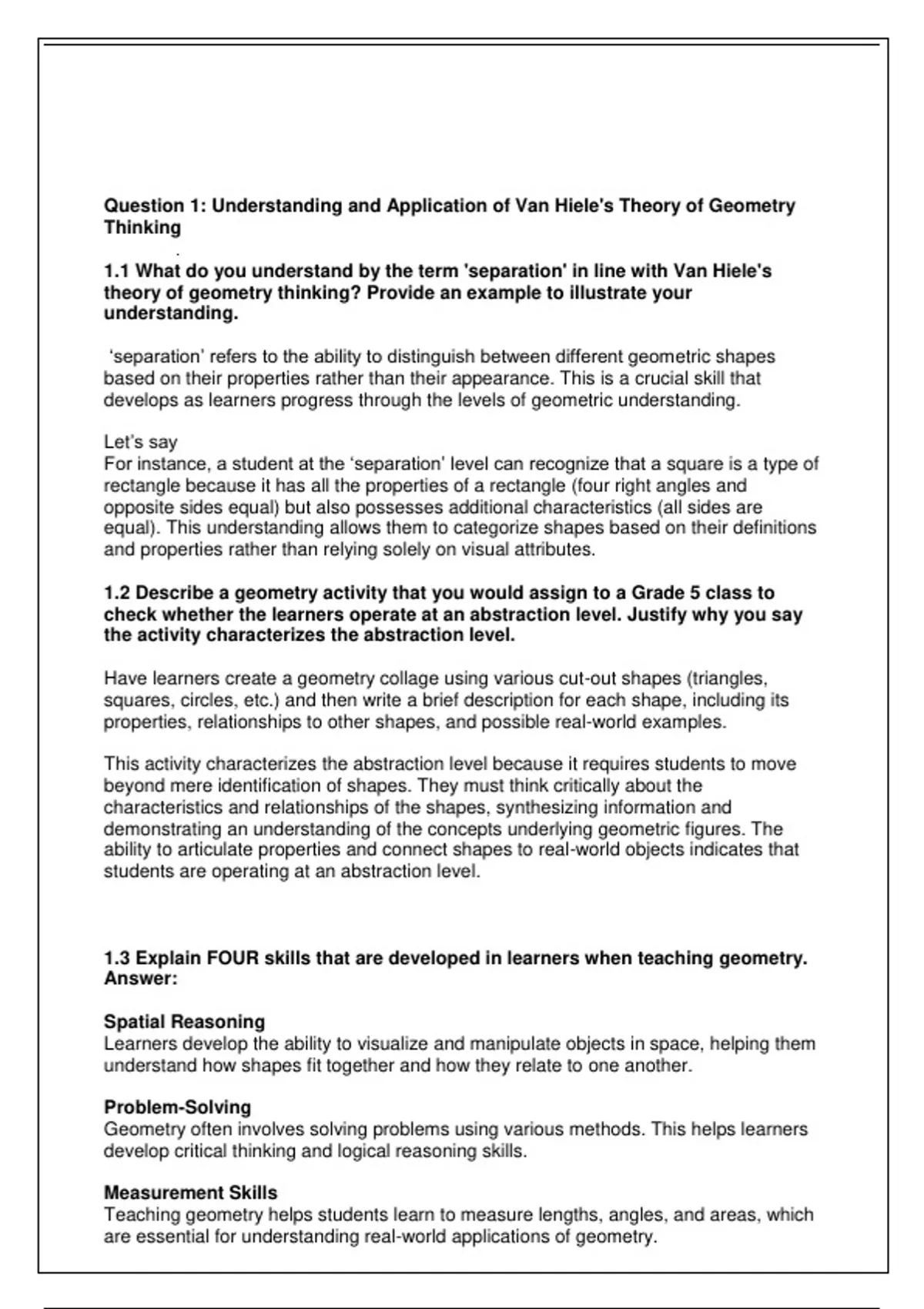 Question 1: Understanding and Application of Van Hiele's Theory of Geometry