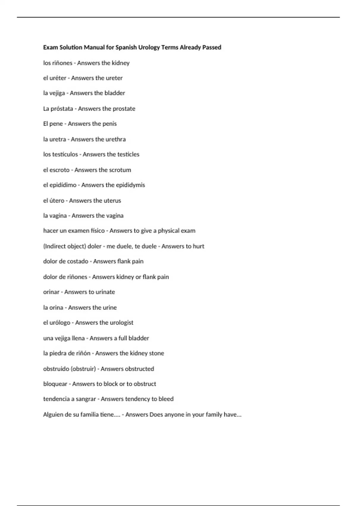 Exam Solution Manual for Spanish Urology Terms Already Passed los riñones - Answers the kidney el uréter - Answers the ureter la vejiga - Answers the bladder La próstata - Answers the prostate El pene - Answers the penis la uretra - Answers the urethra los testículos - Answers the testicles el escroto - Answers the scrotum el epidídimo - Answers the epididymis el útero - Answers the uterus la vagina - Answers the vagina hacer un examen físico - Answers to give a physical exam (Indirect object) doler - me duele, te duele - Answers to hurt dolor de costado - Answers flank pain dolor de riñones - Answers kidney or flank pain orinar - Answers to urinate la orina - Answers the urine el urólogo - Answers the urologist una vejiga llena - Answers a full bladder la piedra de riñón - Answers the kidney stone obstruido (obstruir) - Answers obstructed bloquear - Answers to block or to obstruct tendencia a sangrar - Answers tendency to bleed Alguien de su familia tiene.... - Answers Does anyone in your family have...