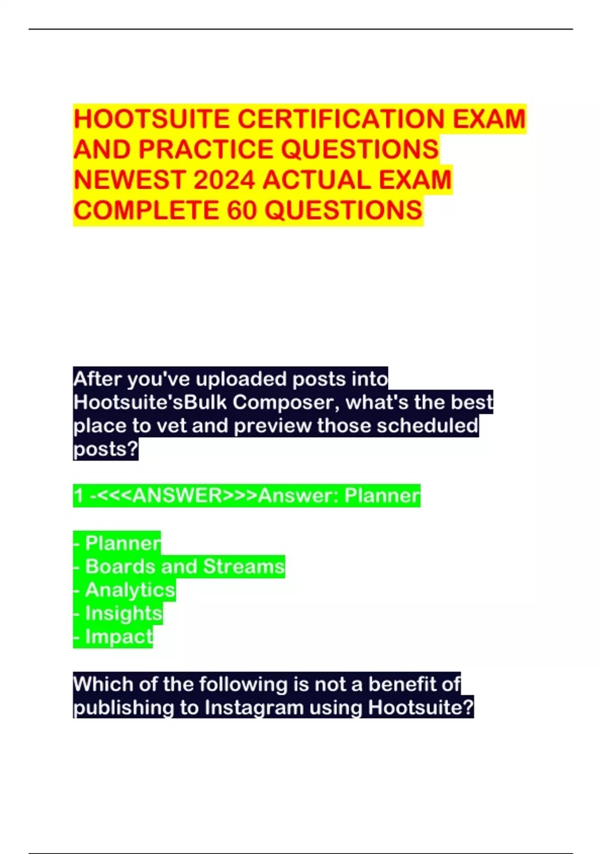 HOOTSUITE CERTIFICATION EXAM AND PRACTICE QUESTIONS NEWEST 2024 ACTUAL EXAM COMPLETE 60 QUESTIONS