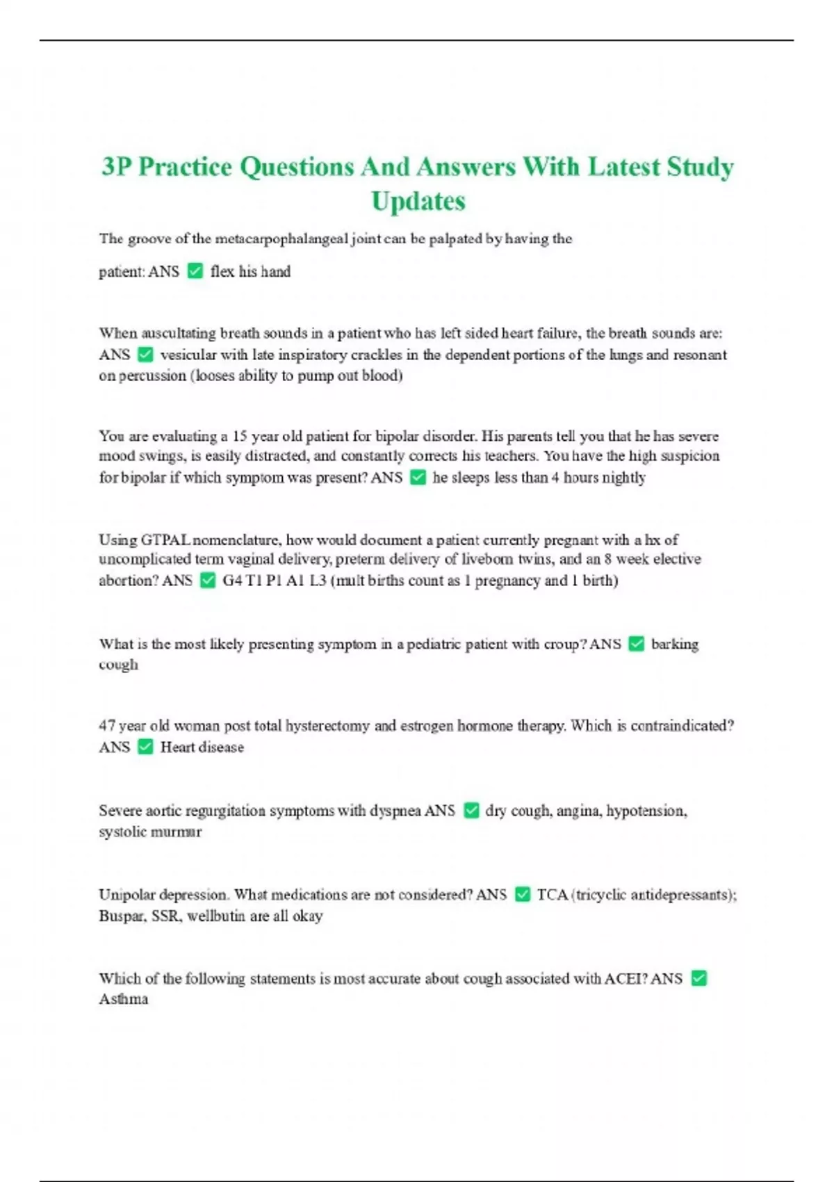 3P Practice Questions And Answers With Latest Study Updates The groove of the metacarpophalangeal joint can be palpated by having the patient: ANS flex his hand When auscultating breath sounds in a patient who has left sided heart failure, the breath sounds are: ANS vesicular with late inspiratory crackles in the dependent portions of the lungs and resonant on percussion (looses ability to pump out blood) You are evaluating a 15 year old patient for bipolar disorder. His parents tell you that he has severe mood swings, is easily distracted, and constantly corrects his teachers. You have the high suspicion for bipolar if which symptom was present? ANS he sleeps less than 4 hours nightly Using GTPAL nomenclature, how would document a patient currently pregnant with a hx of uncomplicated term vaginal delivery, preterm delivery of liveborn twins, and an 8 week elective abortion? ANS G4 T1 P1 A1 L3 (mult births count as 1 pregnancy and 1 birth)