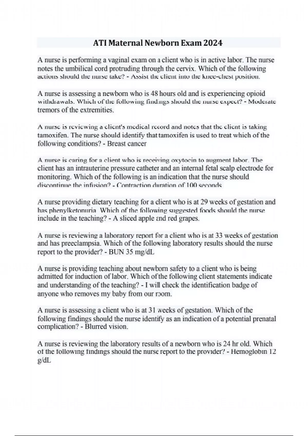 A nurse is performing a vaginal exam on a client who is in active labor. The nurse notes the umbilical cord protruding through the cervix. Which of the following actions should the nurse take? - Assist the client into the knee-chest position. A nurse is assessing a newborn who is 48 hours old and is experiencing opioid withdrawals. Which of the following findings should the nurse expect? - Moderate tremors of the extremities. A nurse is reviewing a client's medical record and notes that the client is taking tamoxifen. The nurse should identify that tamoxifen is used to treat which of the following conditions? - Breast cancer A nurse is caring for a client who is receiving oxytocin to augment labor. The client has an intrauterine pressure catheter and an internal fetal scalp electrode for monitoring. Which of the following is an indication that the nurse should discontinue the infusion? - Contraction duration of 100 seconds. A nurse providing dietary teaching for a client who is at 29 weeks of gestation and has phenylketonuria. Which of the following suggested foods should the nurse include in the teaching? - A sliced apple and red grapes. A nurse is reviewing a laboratory report for a client who is at 33 weeks of gestation and has preeclampsia. Which of the following laboratory results should the nurse report to the provider? - BUN 35 mg/dL A nurse is providing teaching about newborn safety to a client who is being admitted for induction of labor. Which of the following client statements indicate and understanding of the teaching? - I will check the identification badge of anyone who removes my baby from our room. A nurse is assessing a client who is at 31 weeks of gestation. Which of the following findings should the nurse identify as an indication of a potential prenatal complication? - Blurred vision. A nurse is reviewing the laboratory results of a newborn who is 24 hr old. Which of the following findings should the nurse report to the provider? - Hemoglobin 12 g/dL A nurse is caring for a client who is in labor and has an epidural for pain control. Which of the following clinical manifestations is an adverse effect of epidural anesthesia? - Pruritus A nurse is teaching a client about using an intrauterine device (IUD) for contraception. Which of the following client statements indicate an understanding of the teaching? - I should check for the string each month after menstruation. A nurse is assessing a newborn who is 10 hr old. Which of the following findings should the nurse report to the provider? - Nasal flaring. A nurse is assessing a client who gave birth 1 week ago. The client states, "I don't know what's wrong. I love my baby, but I feel so let down and I seem to cry for no reason. The nurse should identify the client is experiencing which of the following responses to birth? - Postpartum blues A nurse is providing teaching to a group of women about risk factors for ovarian cancer. Which of the following risk factors should the nurse include? (Select all that apply.) - Nulliparity History of breast cancer Hormone replacement therapy A nurse is caring for a client who is at 38 weeks of gestation and is experiencing continuous abdominal pain and vaginal bleeding. The client has a history of cocaine use. The nurse should identify that the client is likely experiencing which of the following complications? - Abruptio placentae A nurse is caring for a client who is postpartum, has a deep-vein thrombosis, and is receiving heparin therapy via subcutaneous injections. Which of the following actions should the nurse take? - Administer the injection in the client's abdomen. A nurse is caring for a newborn whose father voices concerns about his ability to bond with his baby. Which of the following actions should the nurse take to facilitate bonding? (Select all that apply.) - Point out to the father that the newborn turns toward his voice. Encourage the father to touch and stroke the newborn's skin. Demonstrate diapering and swaddling techniques for the father. A nurse is providing teaching to a client who has fibrocystic breast changes and is experiencing breast discomfort during menstruation. Which of the following instructions should the nurse include? - Decrease sodium intake before menstruation. A nurse is admitting a client who is at 35 weeks of gestation and is experiencing mild vaginal bleeding due to placenta previa. Which of the following actions should the nurse plan to take? - Initiate continuous monitoring of the FHR. A nurse is providing teaching to a client who is at 32 weeks of gestation and is experiencing stress incontinence. Which of the following information should the nurse include in the teaching? (Select all that apply.) - Practice Kegel exercises. Reduce caffeine intake. A nurse is caring for a client who is receiving oxytocin to augment labor. The nurse notes recurrent variable decelerations of the FHR. Which of the following actions should the nurse take first? - Place the client in a left lateral position. A nurse is admitting a client who is at 33 weeks of gestation and has preeclampsia with severe features. Which of the following actions should the nurse take? - Initiate seizure precautions for the client. A nurse is caring for a client who is in the transition phase of labor. Which of the following actions should the nurse take? - Encourage the client to use a pant-blow breathing pattern. A nurse is assessing a newborn who was born vaginally with vacuum extractor assistance. The nurse notes swelling over the newborn's head that crosses the suture line. The nurse should identify the swelling as which of the following findings? - Caput succedaneum A nurse is caring for a newborn who has a blood glucose level of 45 mg/dL. Which of the following actions should the nurse take? - Encourage the mother to breastfeed the newborn. A nurse is assessing a newborn who is 48 hr old and has a maternal history of methadone use during pregnancy. Which of the following mani