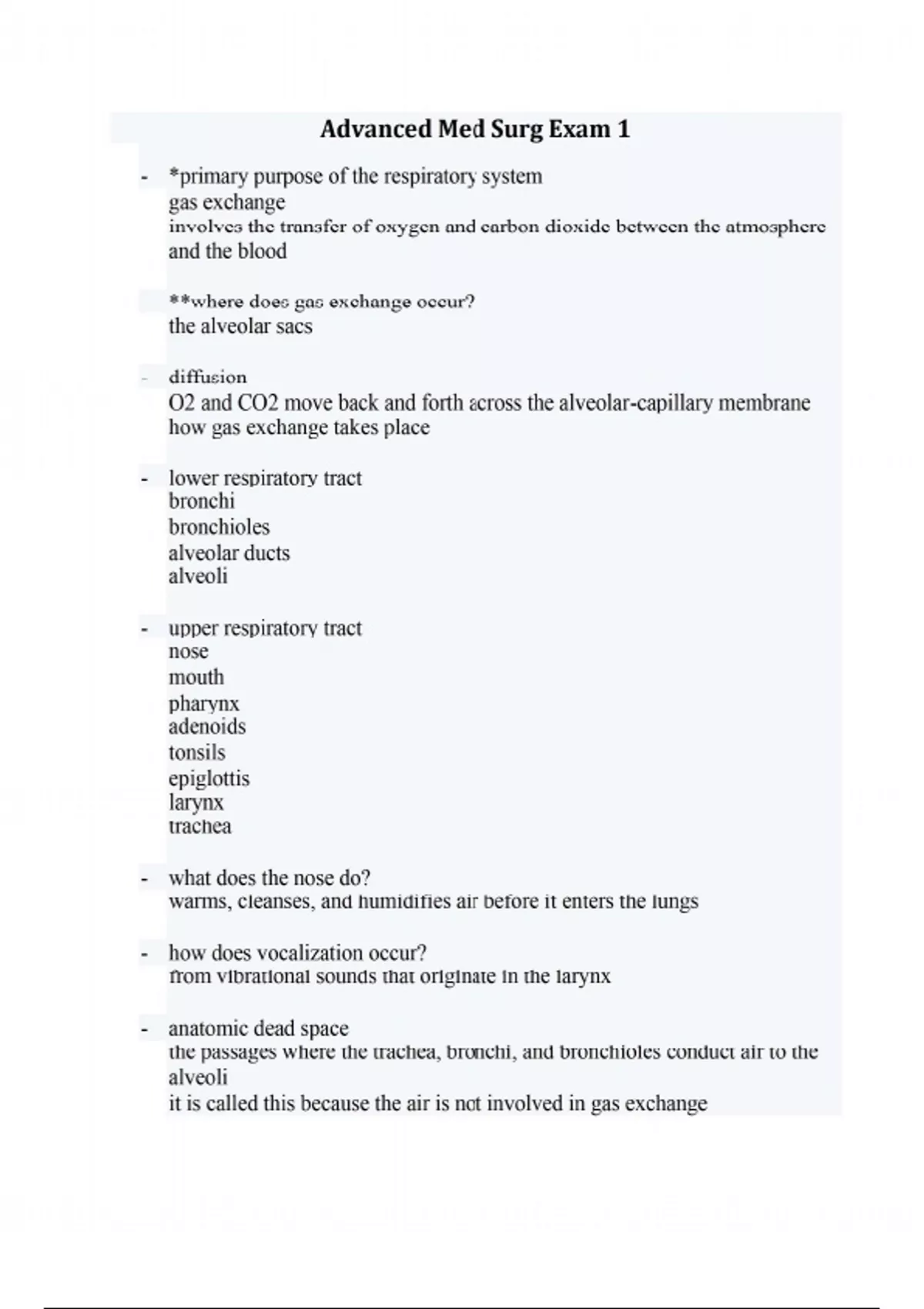 - *primary purpose of the respiratory system gas exchange involves the transfer of oxygen and carbon dioxide between the atmosphere and the blood - **where does gas exchange occur? the alveolar sacs - diffusion O2 and CO2 move back and forth across the alveolar-capillary membrane how gas exchange takes place - lower respiratory tract bronchi bronchioles alveolar ducts alveoli - upper respiratory tract nose mouth pharynx adenoids tonsils epiglottis larynx trachea - what does the nose do? warms, cleanses, and humidifies air before it enters the lungs - how does vocalization occur? from vibrational sounds that originate in the larynx - anatomic dead space the passages where the trachea, bronchi, and bronchioles conduct air to the alveoli it is called this because the air is not involved in gas exchange - contraction of the diaphragm (the major muscle of respiration) results in what? decreased intrathoracic pressure, which allows air to enter the lungs - surfactant a lipoprotein that helps to keep the alveoli open, thus preventing alveolar collapse - physiology of respiration oxygenation ventilation inspiration expiration - oxygenation the delivery of oxygen from the atmospheric air to alveolar capillaries and eventual diffusion into the alveoli - ventilation involves inspiration (movement of air into the lungs) and expiration (movement of air out of the lungs) - inspiration breathing in movement of air into the lungs active process involves muscle contration - expiration breathing out movement of air out of the lungs passive process when elastic recoil is reduced, expiration becomes a more active, labored process - compliance are they adapting measure of the ease of expansion of the lungs when decreased, the lungs are harder to inflate ("stiff lungs") - what does it mean when resistance occurs? often indicates some type of impairment to air flow into the lungs, such as narrowed airways or presence of secretions - *why are arterial blood gases important? they are the most effective way to measure oxygen status - ABGs are measured to ... determine oxygenation status, ventilation status, and acid-base balance - arterial oxygen saturation monitoring continuously using a pulse ox. probe applied to a finger, toe, ear, or bridge of nose - CO2 monitoring using transcutaneous carbon dioxide (PtCO2) and end-tidal CO2 (PetCO2) capnography PtCO2 is a noninvasive method of estimating PaCO2 PtCO2 is presented as a graph of expiratory CO2 plotted against time - control of respiration the respiratory center in the medulla in the brainstem responds to chemical and mechanical signals from the body - chemoreceptors respond to changes in the chemical composition (PaCO2 and pH) of the fluid around it - mechanical receptors stimulated by a variety of physiologic factors, such as irritants, muscle stretching, and alveolar wall distortion - respiratory defense mechanisms filtration of air - mucociliary clearance system (movement of mucus) cough reflex: very important; clears the airway by a high-pressure, highvelocity flow of air - reflex of bronchoconstriction: prevent entry of irritants - alveolar macrophages: rapidly phagocytize inhaled foreign particles such as bacteria age-related changes in respiratory system function - can be divided into changes in structure, defense mechanisms, and respiratory control there is much variability in the extent of the changes in persons of the same age the older the patient who has a significant smoking history, is obese, and has a chronic illness is at greatest risk of adverse outcomes - **what do you do before you give a medication? check their levels before you give the medication - diagnostic studies of respiratory system - SpO2 monitoring - ABG analysis - sputum studies: - collected in morning before eating - spontaneous or induced - identify infecting organisms or help confirm a diagnosis - skin tests: - allergies - TB or fungi - bronchoscopy: - bronchi are visualized through a fiberoptic tube - used for diagnostic purposes, obtaining biopsy specimens, and assessing changes resulting from treatment - when patient comes back from procedure you HAVE TO CHECK THE GAG REFLEX BEFORE THEY HAVE ANYTHING TO EAT OR DRINK - lung biopsy: - transbronchial - TTNA - VATS - open biopsy - thoracentesis: - insertion of a large bore needle through the chest wall into the pleural space - gets fluid out of the lungs (assess the lungs sounds when they are done) - also for obtaining specimens for diagnostic evaluation or instilling medication into the pleural space - pulmonary function tests: - measures lung volumes and airflow - spirometry (800-1,000) - can diagnose pulmonary disease, monitor disease progression, evaluate disability, and evaluate response to bronchodilators - can also determine the ability to wean and extubate from mechanical ventilation in the acute setting - exercise testing: - used in diagnosis, measuring functional capacity and response to treatment, and determining level of activity tolerance - 6-minute walk test - chest x-ray (good for progression of disease and response to treatment too) - deviated septum - a deflection of the normally straight nasal septum most commonly caused by trauma to the nose - if a nasal fracture is present ... - assess the patient's ability to breathe make sure hemorrhage and leakage of CSF are not present - rhinoplasty - surgical reconstruction of the nose performed for cosmetic reasons or to improve airway function when trauma or developmental deformities result in nasal obstruction - epistaxis - nosebleed variety of causes treat with simple measures first, treat with direct pressure with patient sitting upright if bleeding doesn't stop, apply a vasoconstrictive agent, packing (monitoring respiratory status is critical), or cauterization - allergic rhinitis - inflammation of nasal mucosa - reaction of the nasal mucosa to a specific allergen - classified according to the causative agent and frequency of symptoms - causative agent: seasonal 