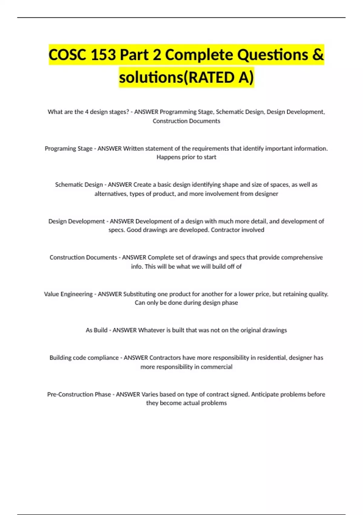 What are the 4 design stages? - ANSWER Programming Stage, Schematic Design, Design Development, Construction Documents Programing Stage - ANSWER Written statement of the requirements that identify important information. Happens prior to start Schematic Design - ANSWER Create a basic design identifying shape and size of spaces, as well as alternatives, types of product, and more involvement from designer