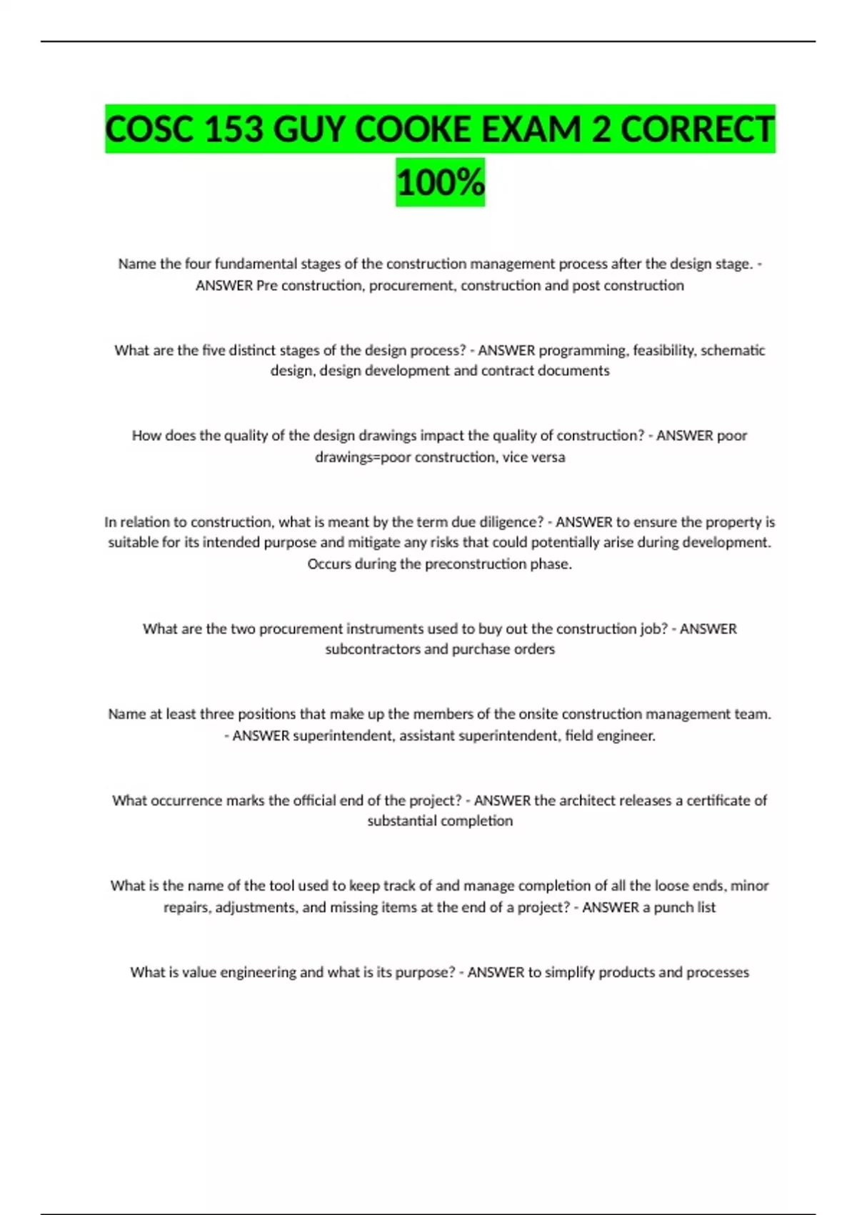 Name the four fundamental stages of the construction management process after the design stage. - ANSWER Pre construction, procurement, construction and post construction What are the five distinct stages of the design process? - ANSWER programming, feasibility, schematic design, design development and contract documents How does the quality of the design drawings impact the quality of construction? - ANSWER poor drawings=poor construction, vice versa