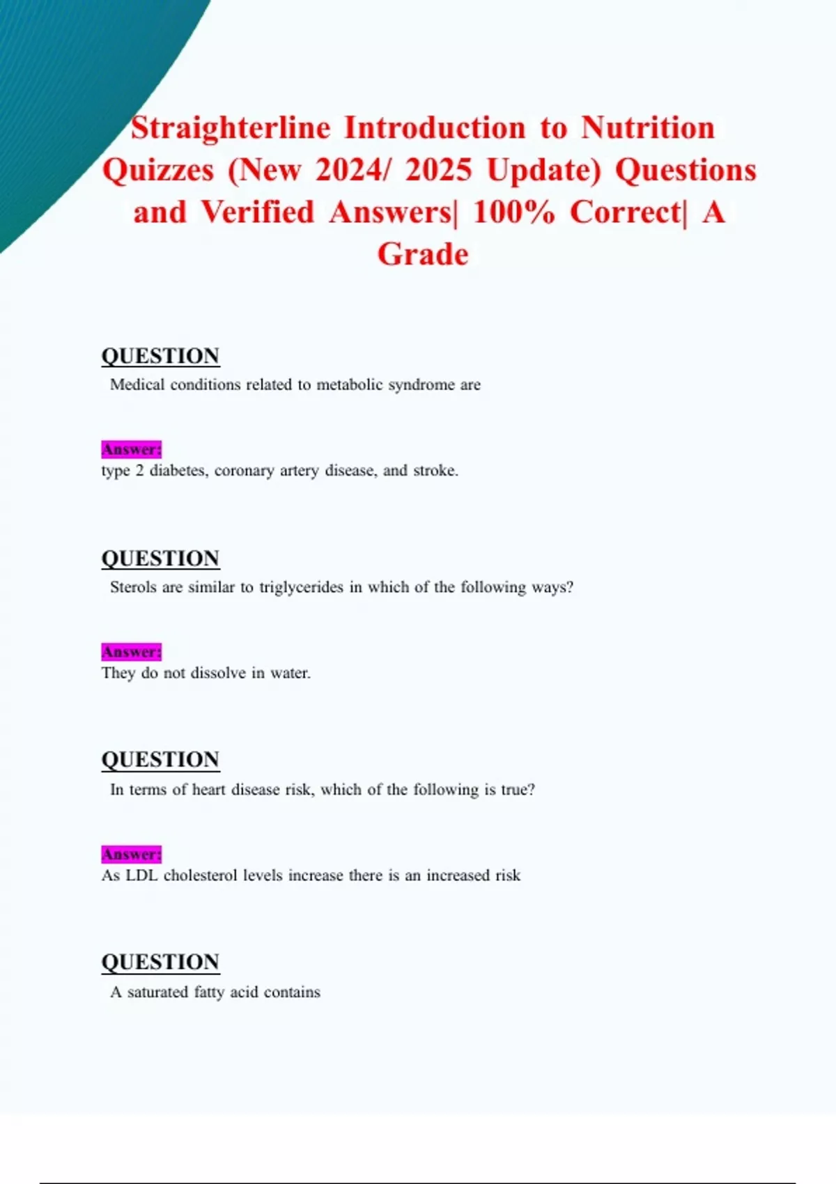 Straighterline Introduction to Nutrition Quizzes (New 2024/ 2025 Update) Questions and Verified Answers| 100% Correct| A Grade