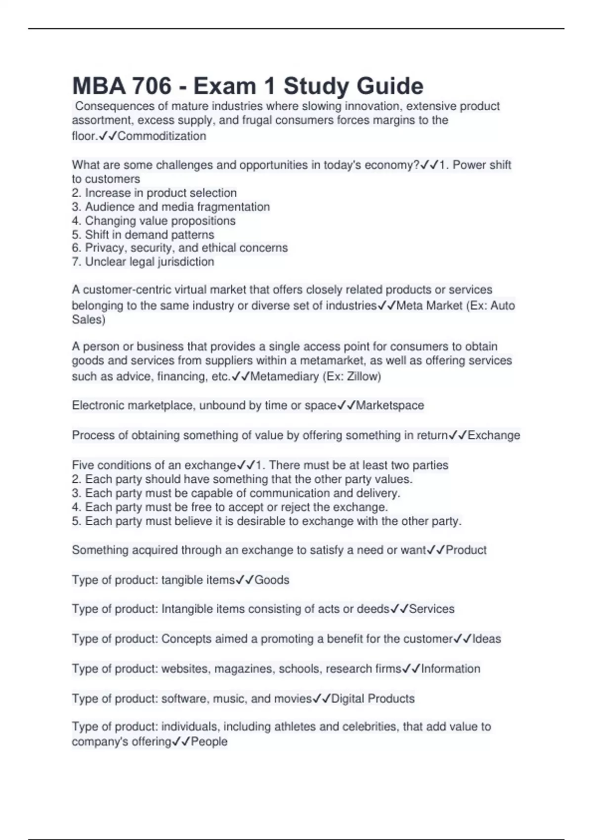 MBA 706 - Exam 1 Study Guide Consequences of mature industries where slowing innovation, extensive product assortment, excess supply, and frugal consumers forces margins to the floor.Commoditization What are some challenges and opportunities in today's economy?1. Power shift to customers 2. Increase in product selection 3. Audience and media fragmentation 4. Changing value propositions 5. Shift in demand patterns 6. Privacy, security, and ethical concerns 7. Unclear legal jurisdiction A customer-centric virtual market that offers closely related products or services belonging to the same industry or diverse set of industriesMeta Market (Ex: Auto Sales) A person or business that provides a single access point for consumers to obtain goods and services from suppliers within a metamarket, as well as offering services such as advice, financing, etc.Metamediary (Ex: Zillow) Electronic marketplace, unbound by time or spaceMarketspace Process of obtaining something of value by offering something in returnExchange Five conditions of an exchange1. There must be at least two parties 2. Each party should have something that the other party values. 3. Each party must be capable of communication and delivery. 4. Each party must be free to accept or reject the exchange. 5. Each party must believe it is desirable to exchange with the other party.