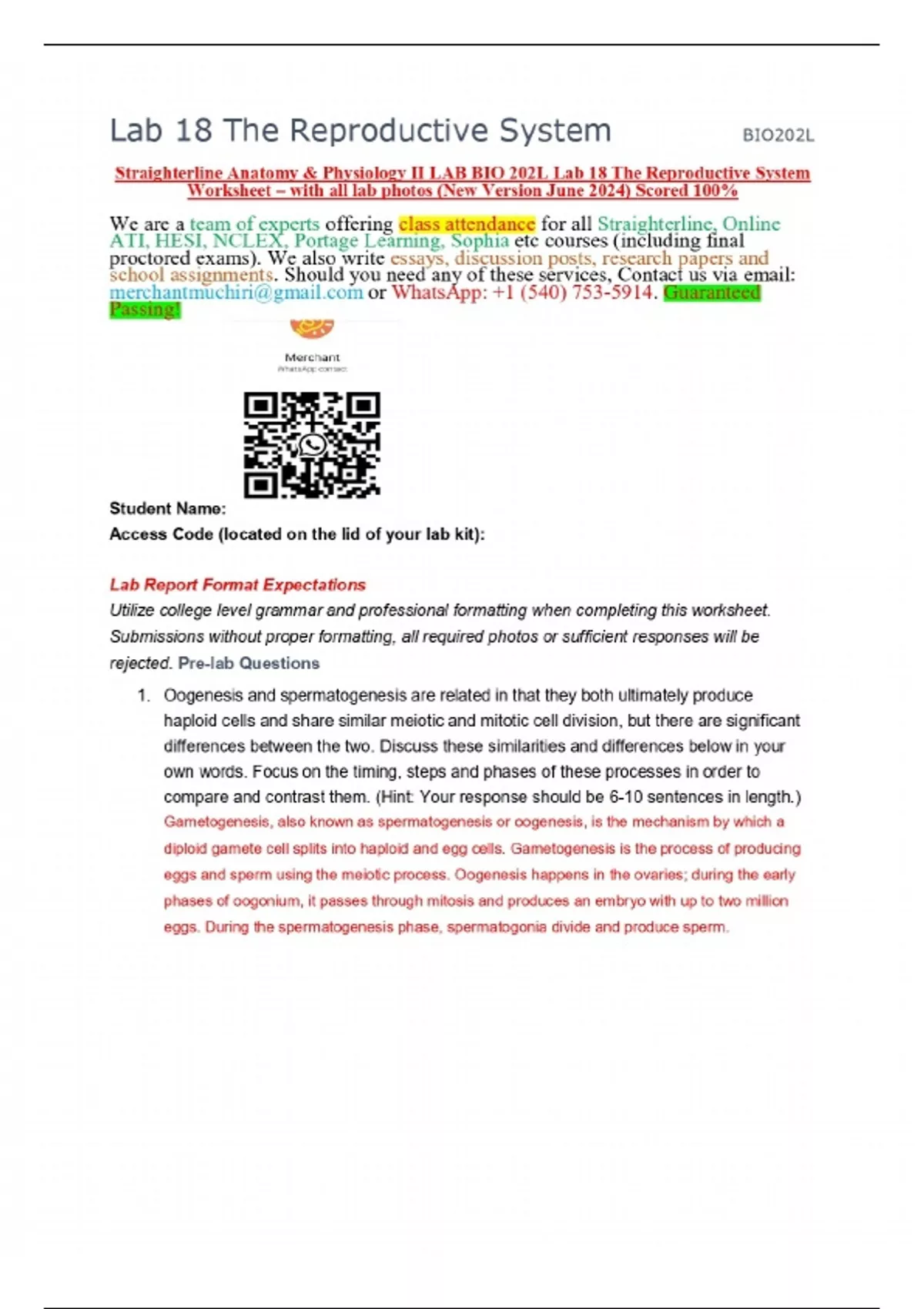 Straighterline Anatomy & Physiology II LAB BIO 202L Lab 18 The Reproductive System Worksheet – with all lab photos (New Version June 2024) Scored 100%