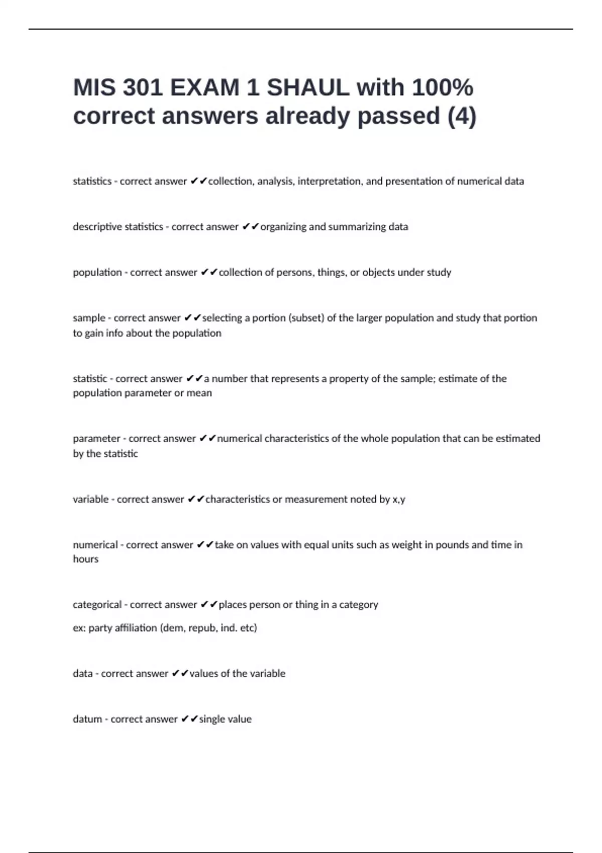 statistics - correct answer ✔✔collection, analysis, interpretation, and presentation of numerical data