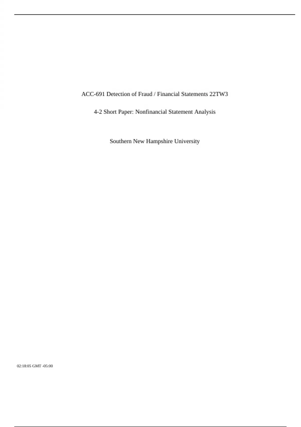 ACC-691 Detection of Fraud / Financial Statements 22TW3 4-2 Short Paper: Nonfinancial Statement Analysis Southern New Hampshire University 02:18:05 GMT -05:00 Company Selection The company I™ve chosen to discuss for this assignment is Microsoft Corporation (MSFT) and the year is fiscal year ending June 30, 2022. Microsoft is a well-known technology company that is the manufacturer of Xbox gaming consoles, laptops, tablets, Microsoft Windows OS, phones, and many other devices and peripherals. Microsoft is one of the largest technology companies, aside Apple, Inc. and Samsung. Additionally, as recently as this year, Microsoft is the newest owner of Activision Blizzard and ZeniMax Media. Activision Blizzard is a very well- known gaming software that is the host of World of Warcraft, Call of Duty, and Diablo. ZeniMax Media is the parent company to Bethesda