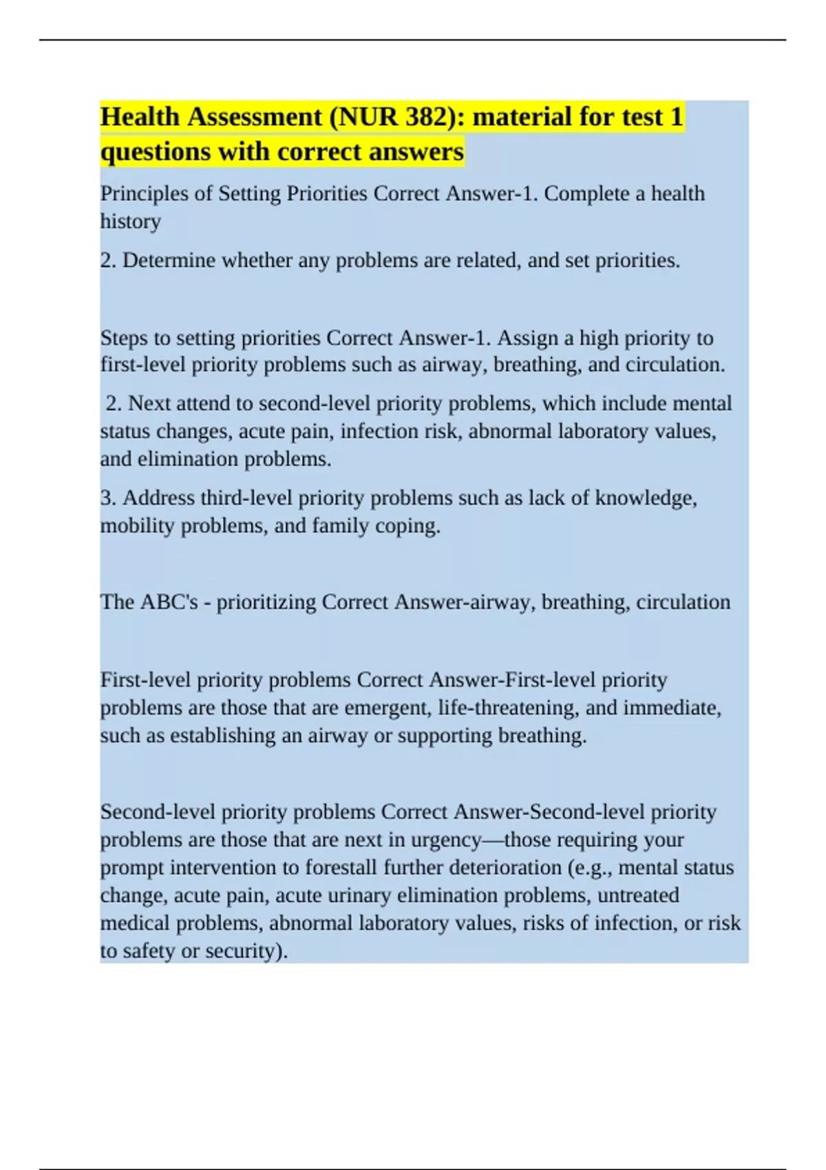 Health Assessment (NUR 382): material for test 1 questions with correct answers