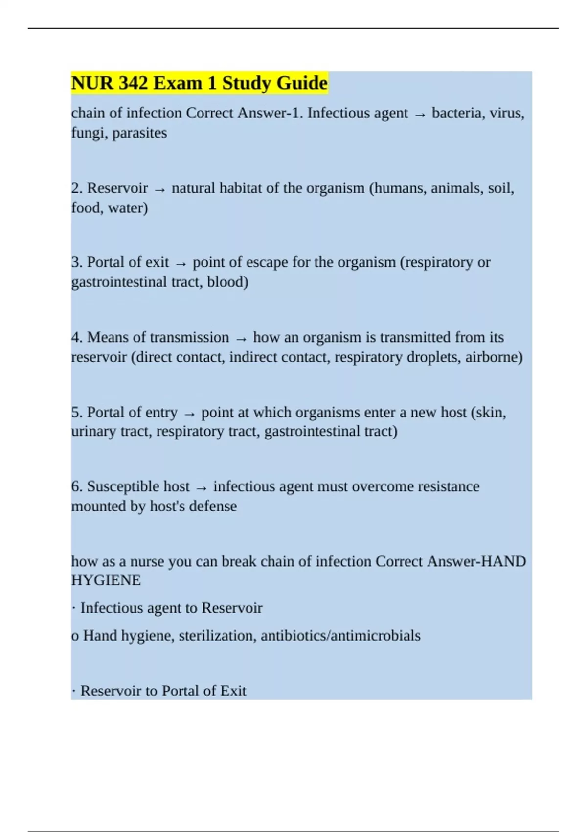 chain of infection Correct Answer-1. Infectious agent → bacteria, virus, fungi, parasites 2. Reservoir → natural habitat of the organism (humans, animals, soil, food, water) 3. Portal of exit → point of escape for the organism (respiratory or gastrointestinal tract, blood) 4. Means of transmission → how an organism is transmitted from its reservoir (direct contact, indirect contact, respiratory droplets, airborne) 5. Portal of entry → point at which organisms enter a new host (skin, urinary tract, respiratory tract, gastrointestinal tract) 6. Susceptible host → infectious agent must overcome resistance mounted by host's defense how as a nurse you can break chain of infection Correct Answer-HAND HYGIENE · Infectious agent to Reservoir o Hand hygiene, sterilization, antibiotics/antimicrobials · Reservoir to Portal of Exit o Transmission-based precaution
