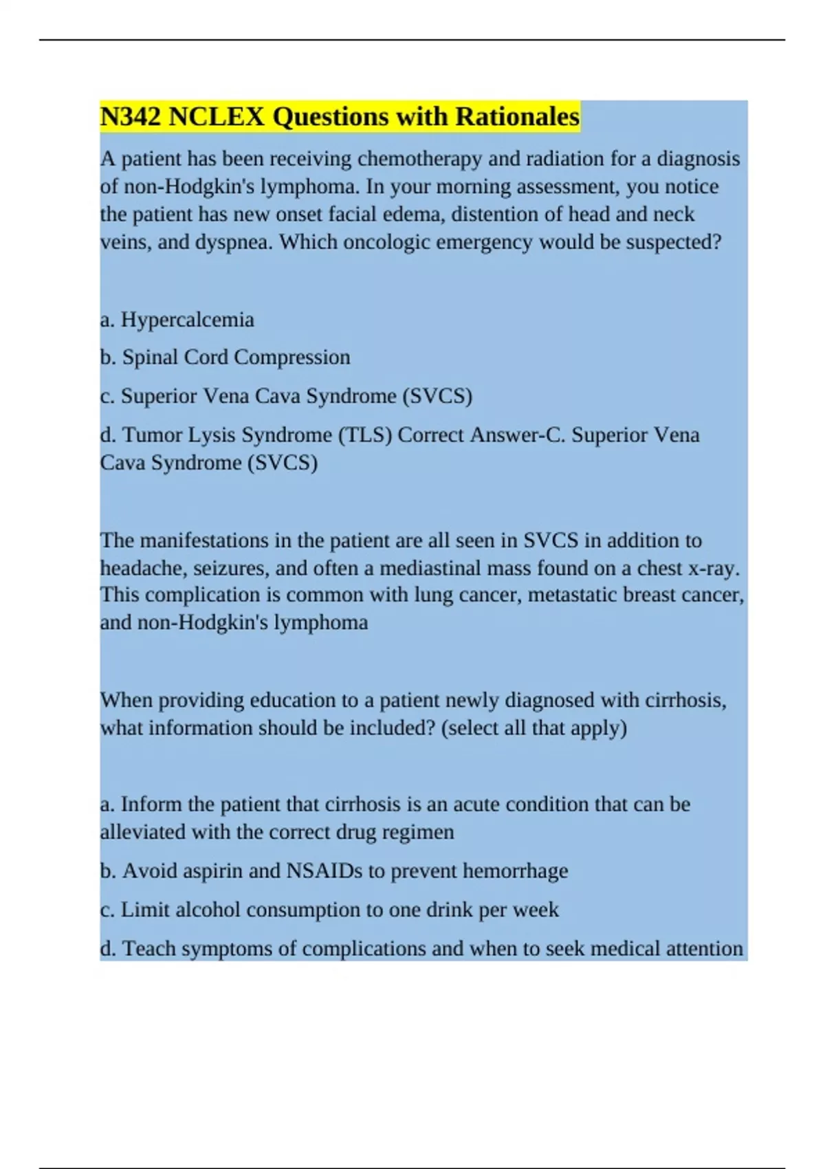 d. Tumor Lysis Syndrome (TLS) Correct Answer-C. Superior Vena
