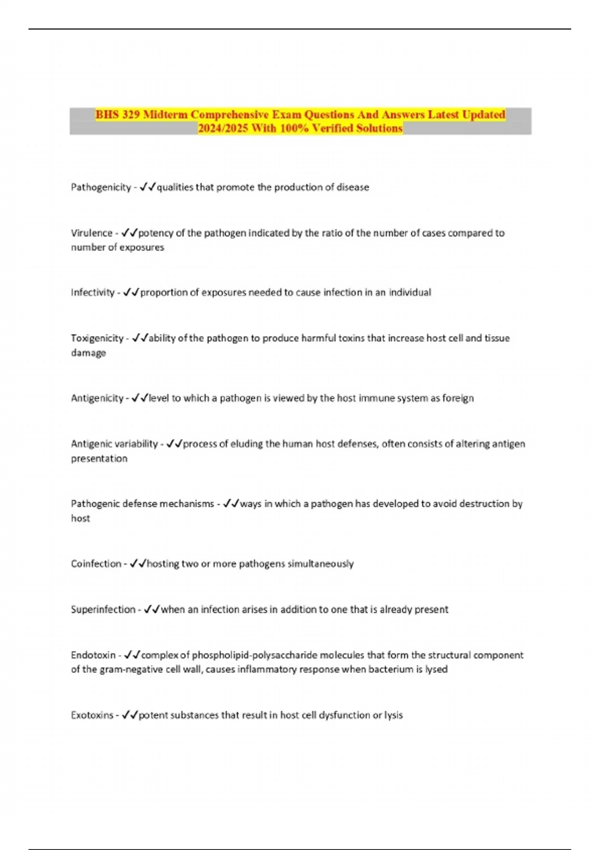 BHS 329 Midterm Comprehensive Exam Questions And Answers Latest Updated 2024/2025 With 100% Verified Solutions