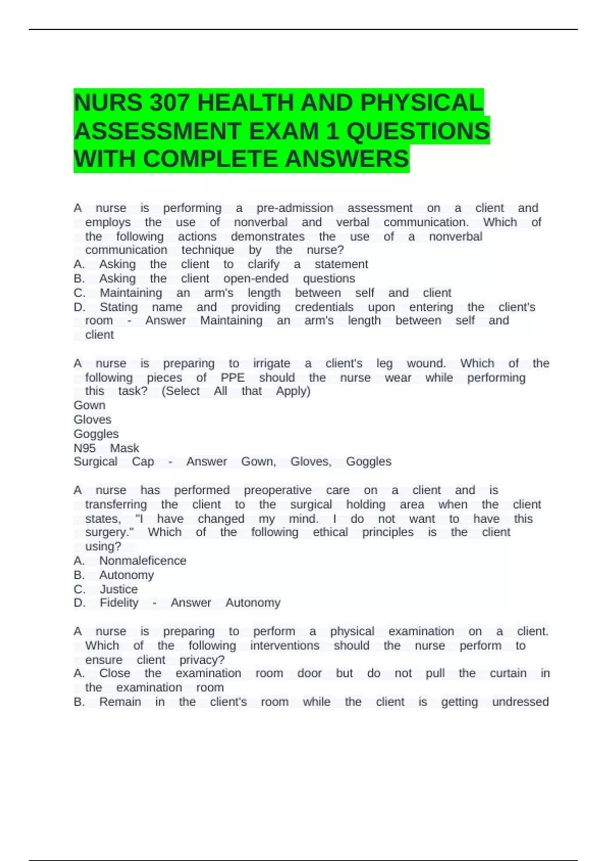 NURS 307 HEALTH AND PHYSICAL ASSESSMENT EXAM 1 QUESTIONS WITH COMPLETE ANSWERS.