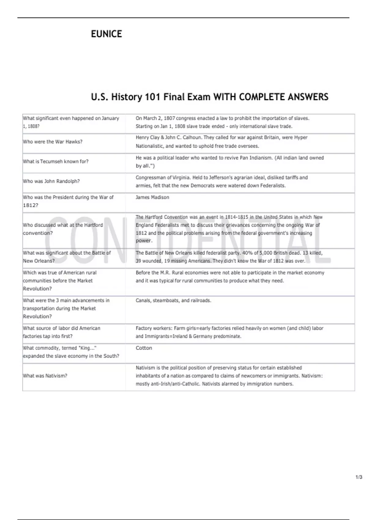 U.S. History 101 Final Exam WITH COMPLETE ANSWERS