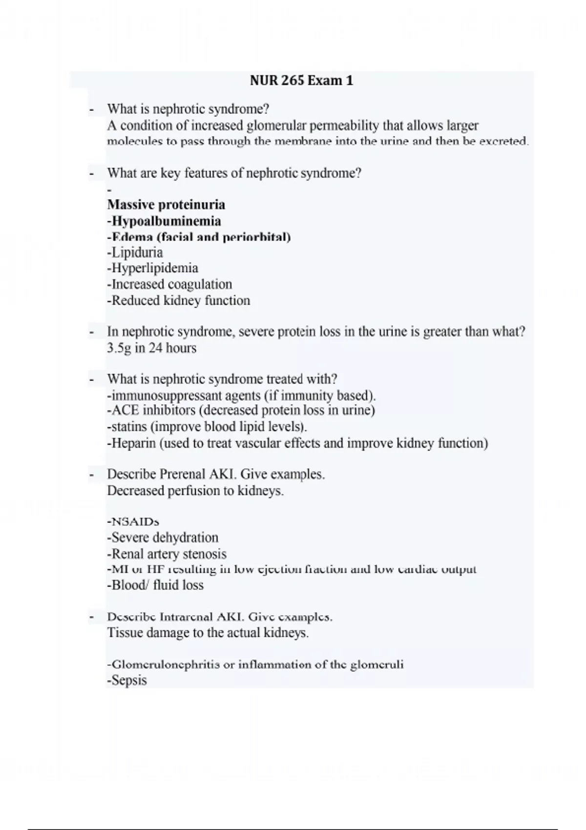 - What is nephrotic syndrome? A condition of increased glomerular permeability that allows larger molecules to pass through the membrane into the urine and then be excreted. - What are key features of nephrotic syndrome? - Massive proteinuria -Hypoalbuminemia -Edema (facial and periorbital) -Lipiduria -Hyperlipidemia -Increased coagulation -Reduced kidney function - In nephrotic syndrome, severe protein loss in the urine is greater than what? 3.5g in 24 hours - What is nephrotic syndrome treated with? -immunosuppressant agents (if immunity based). -ACE inhibitors (decreased protein loss in urine) -statins (improve blood lipid levels). -Heparin (used to treat vascular effects and improve kidney function) - Describe Prerenal AKI. Give examples. Decreased perfusion to kidneys. -NSAIDs -Severe dehydration -Renal artery stenosis -MI or HF resulting in low ejection fraction and low cardiac output -Blood/ fluid loss - Describe Intrarenal AKI. Give examples. Tissue damage to the actual kidneys. -Glomerulonephritis or inflammation of the glomeruli -Sepsis -Intrarenal bleeding -Pyelonephritis - Describe Postrenal AKI. Give examples. Obstruction that occurs after the kidney. -Enlarged prostate (BPH) -Bladder Cancer -Kidney stones - How do you determine the mean arterial pressure (MAP)? Systolic + (Diastolic*2) /3 - What is the MAP needed to perfuse the kidneys? 65 mmHg - What are examples of nephrotoxic drugs? -NSAIDS -Metformin -Diuretics -Antibiotics (especially -mycin) -Contrast dye - During the diuretic phase of AKI, what needs to be monitored? Watch for dehydration and make sure output is greater than input - What are the dietary restrictions for an AKI patient? -Low protein -Low sodium -Fluid restriction: mL day (for anything except perfusion problem) - What are the 2 most common causes of CKD? -HTN -Uncontrolled diabetes - What is azotemia? Nitrogenous waste build up - What are manifestations of uremia? •Metallic taste in mouth •Anorexia •Nausea/vomiting •Muscle cramps •Uremic frost on skin •Itching •Fatigue and lethargy •Hiccups •Edema •Dyspnea •Paresthesia's - What effects can CKD have on the cardiac system -HTN -Heart failure (major problem. Call the doctor) -Pericarditis - What effects can CKD have on the Integumentary system -Uremic frost - What are the dietary restrictions on CKD? -Protein (restrict early in disease process to preserve kidney function) -Potassium -Fluid -Sodium - Describe hemodialysis -3x a week- 4-5 hours -At risk for bleeding do to heparin -Extremely fatigued post. -Vitals and weight before and after -Slight fever post is normal. Monitor. - Describe peritoneal dialysis -Sterile procedure at home where catheter is placed into the abdomen -Wear a mask -Solution may be warmed using a heating bag or blanket, not microwave! -Make sure patient turns and repositions to mix solution in the cavity - Describe nursing care for an AV fistula. -Palpate and auscultate- bruit and thrill -Distal pulses -ROM- helps form the fistula -Monitor for infection -No heavy lifting or carrying -No pressure -Aneurysm can form at AV fistula site - Describe dialysis disequilibrium syndrome -Life threatening! (occurs if fluid is pulled off too fast) -S/S: restless, headache, decreased LOC, seizures, coma -Call a rapid immediately -Give barbiturates and anticonvulsants - What is cirrhosis? An extensive, irreversible scarring of the liver. - What are common causes of cirrhosis? -ETOH -Viral hepatitis (HEP C) - Autoimmune hepatitis -Drugs and chemicals (aetaminophen or anything else hepatotoxic) - What are early S/S of cirrhosis? -Enlarged liver -Fatigue -Weight loss -Anorexia -N/V -Abdominal pain -dry skin -brusing -spinder angioma -fector hep (funky breath) - What are end stage S/S of cirrhosis? -Ascites -Small liver -clotting disorder (bruising, GI bleed) -Jaundice -Elevated ammonia levels (give Lactulose) -Hepatic encephalopathy -Decreased bile production - What are the stages of hepatic encephalopathy? -Stage 1: personality changes, subtle things that may not be recognized -Stage 2: Continuing mental changes, mental confusion, disorientation to time, place, and person -Stage 3: Marked mental confusion, progressive deterioration -Stage 4: metabolic acidosis, unresponsiveness leading to death in most patients, unarousable - What causes hepatic encephalopathy? The buildup of ammonia in the body - Describe the physical assessment of an end stage cirrhosis patient. -Ascites -Jaundice -Coagulation problems -Fatigue -Spider angiomas -Petechiae -Liver flaps (asterixis) - What is a Blake-Moore tube used for? Esophageal Varices - Describe a paracentesis. -A procedure that is needed to get rid of the fluid in the abdomen -Have the pt. void before the procedure (ensures the bladder is out of the way and wont get punctured) -Patient is positioned in fowlers position in bed - What are the treatments for cirrhosis? Transplant is the only cure! - Describe the diet for a patient with cirrhosis. -Small frequent meals -High carbs -High protein -Moderate fats -Moderate vitamins - What medications are given to patients with cirrhosis? -Diuretics -PPI or H blockers -Broad spectrum antibiotics -FFP-coags -Platelets thrombocytopenia -lactulose - Describe acute pancreatitis. A serious and at times life threatening inflammation of the pancreas. It is caused by premature ativation of excessive pancreatic enzymes that destroy tissues and pancreatic cells (basically the pancreas starts digesting itself) - What are causes of acute pancreatitis? -Choleylithiasis -Trauma to pancreas -Chronic ETOH consumption -Toxic drugs - What are signs and symptoms of acute pancreatitis? -Middle epigastric/left upper quadrant -Boring pain that doesn't radiate, but rather goes through their body -Sudden onset -Radiates to back, left shoulder, and flank area -Jaundice- due to bilirubin increase -Nausea and vomiting - How is acute pancreatits diagnosed? -Cat scan first -#1 diagnostic is amylase and lipase labs - Describe t